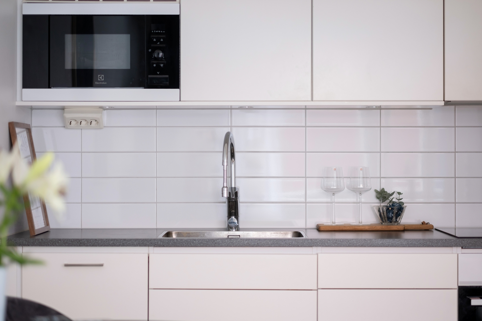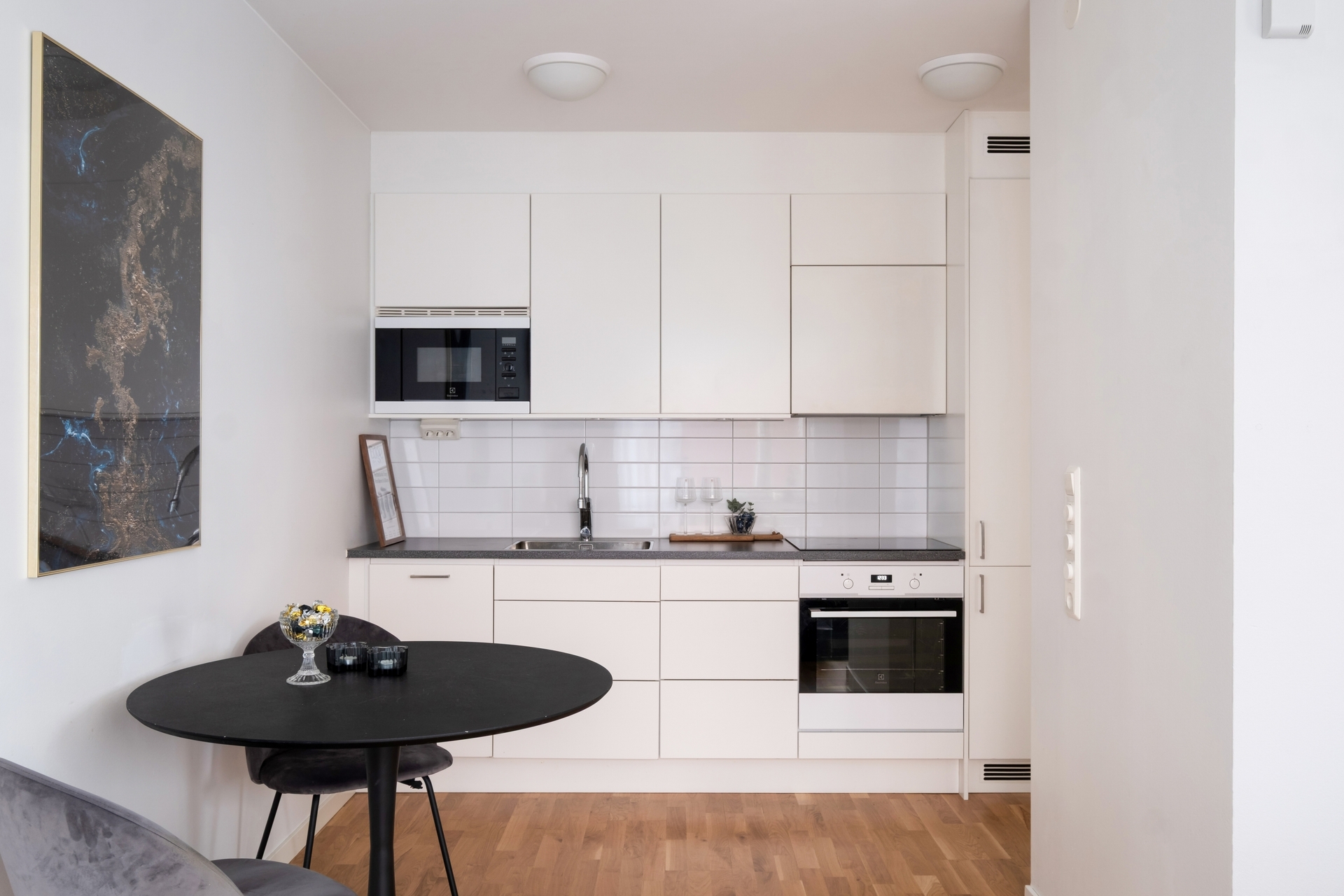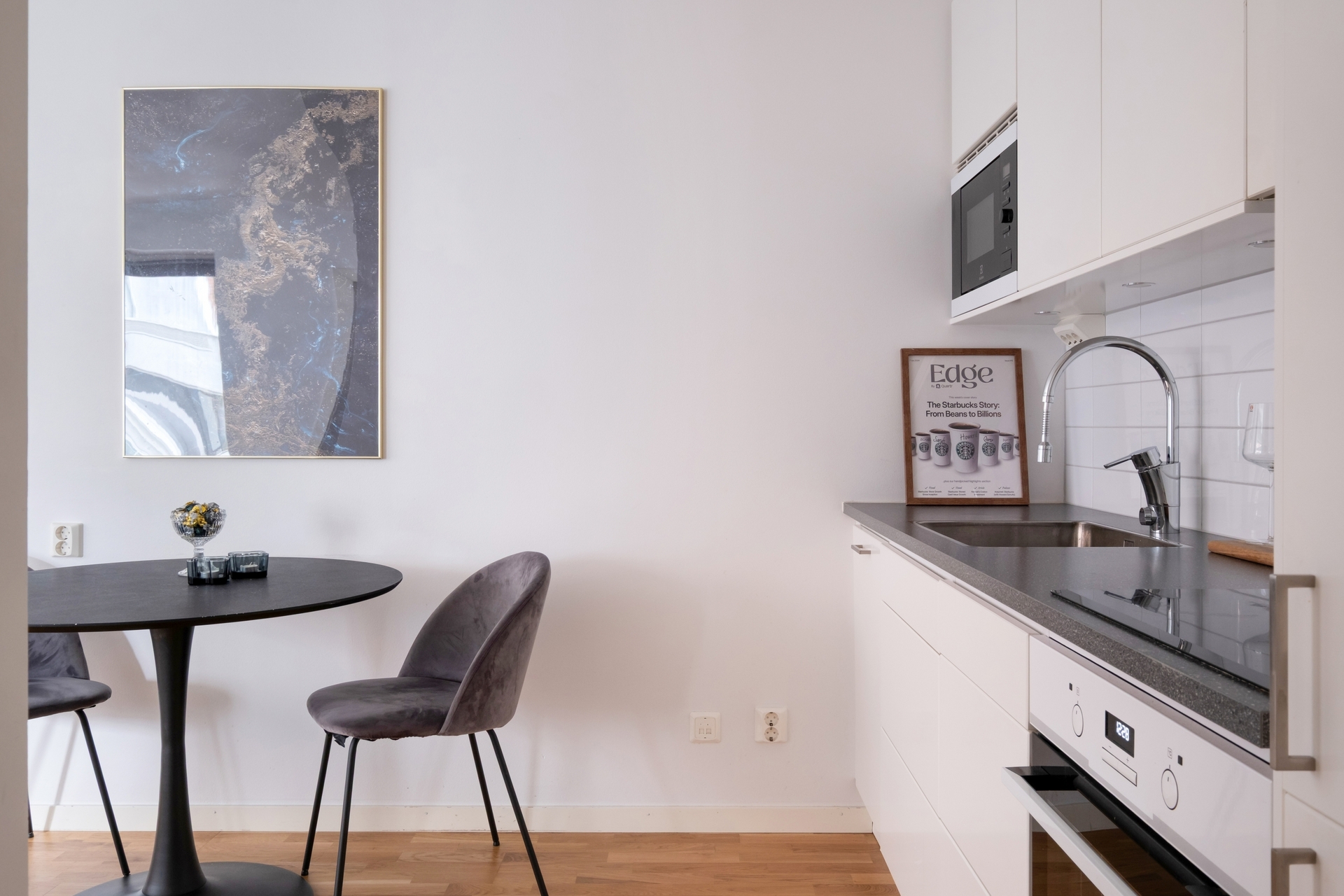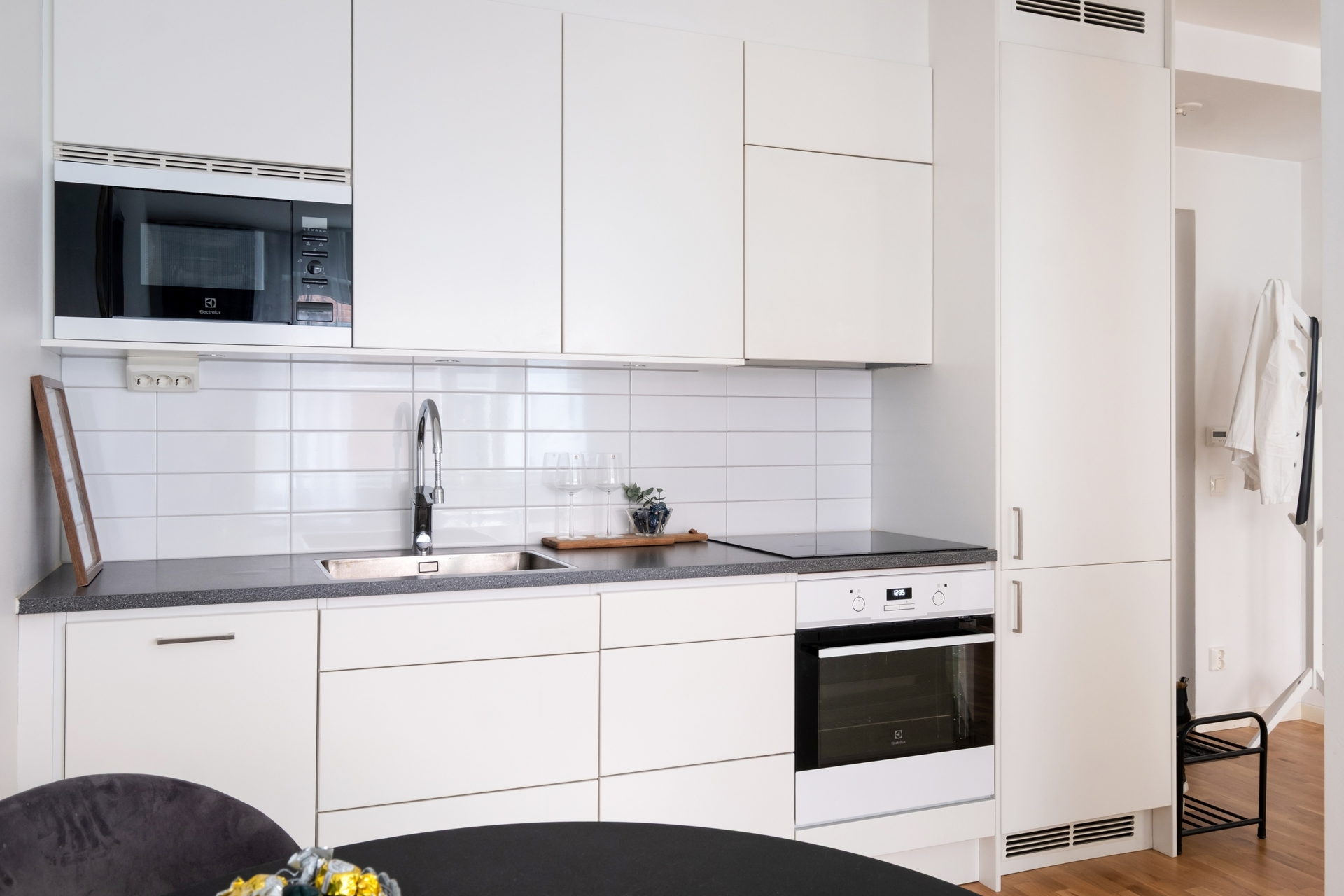 Stilfullt och välplanerat kök med gott om förvaringsmöjligheter bakom vita luckor. Den mörka bänkskivan ger en elegant kontrast till det vita kaklet och skapar ett stilrent helhetsintryck. Köket är utrustat med moderna vitvaror såsom ugn, induktionshäll, diskmaskin, kyl/frys samt mikrovågsugn i högskåp. Öppen planlösning mot vardagsrum, perfekt för både matlagning och socialt umgänge.