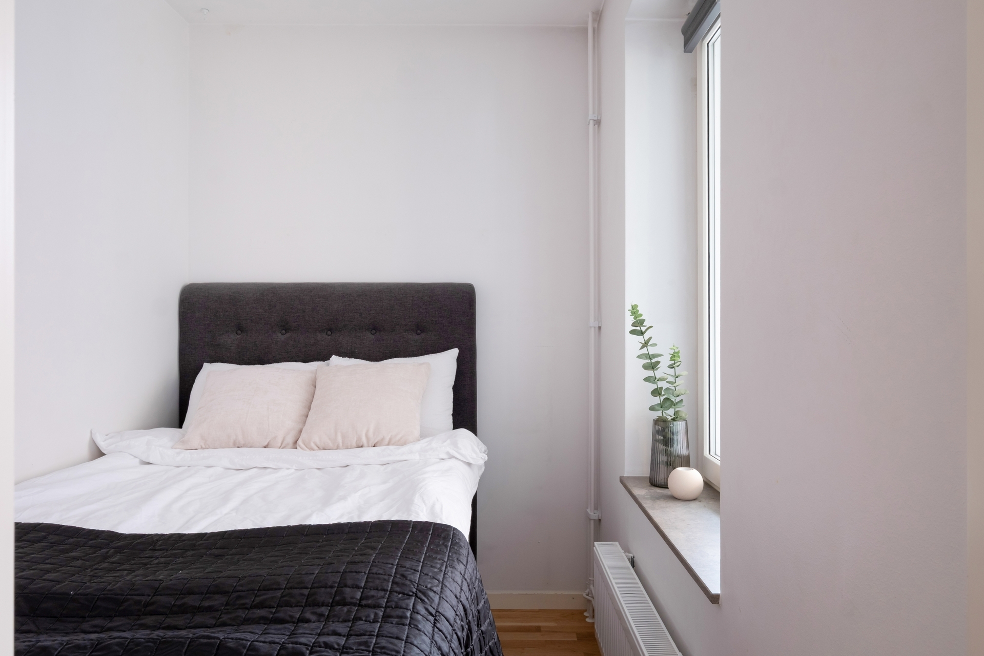 Rofyllt sovrum med plats för en större säng och tillhörande möbler. Fönstret vetter mot den inglasade balkongen och bidrar till ett behagligt ljusinsläpp som gör rummet både ljust och inbjudande.