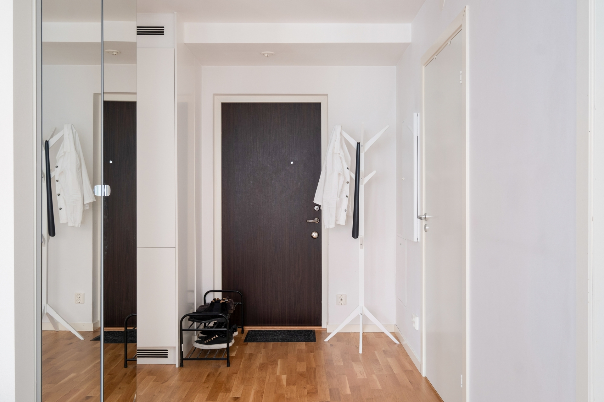 Välkomnande hall med gott om plats för både ytterkläder och skor. Här finns utrymme för klädhängare samt förvaring i två garderober med spegeldörrar. Den genomgående ekparketten binder ihop bostaden på ett smakfullt sätt, medan de ljusa väggarna bidrar till ett luftigt och fräscht intryck.