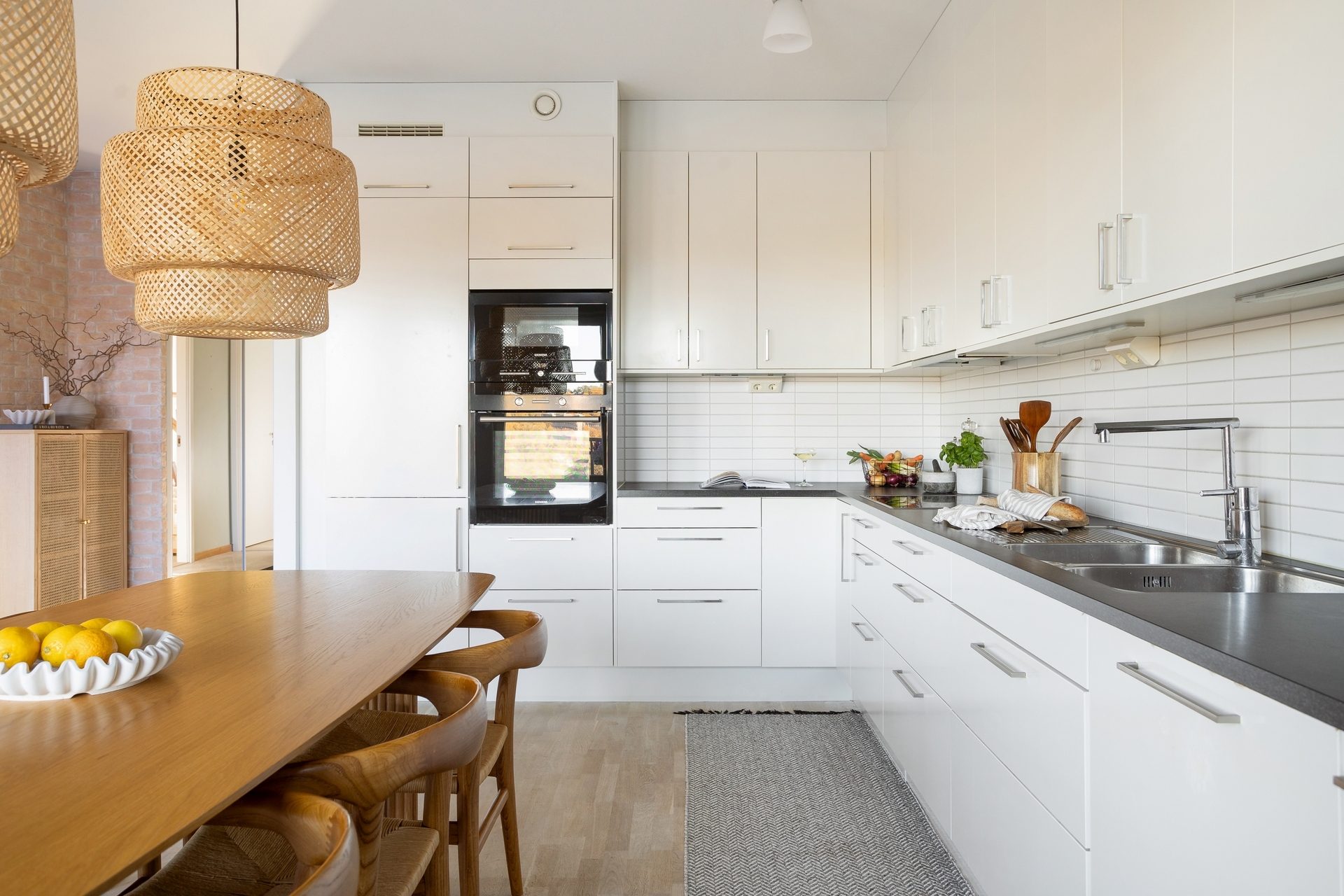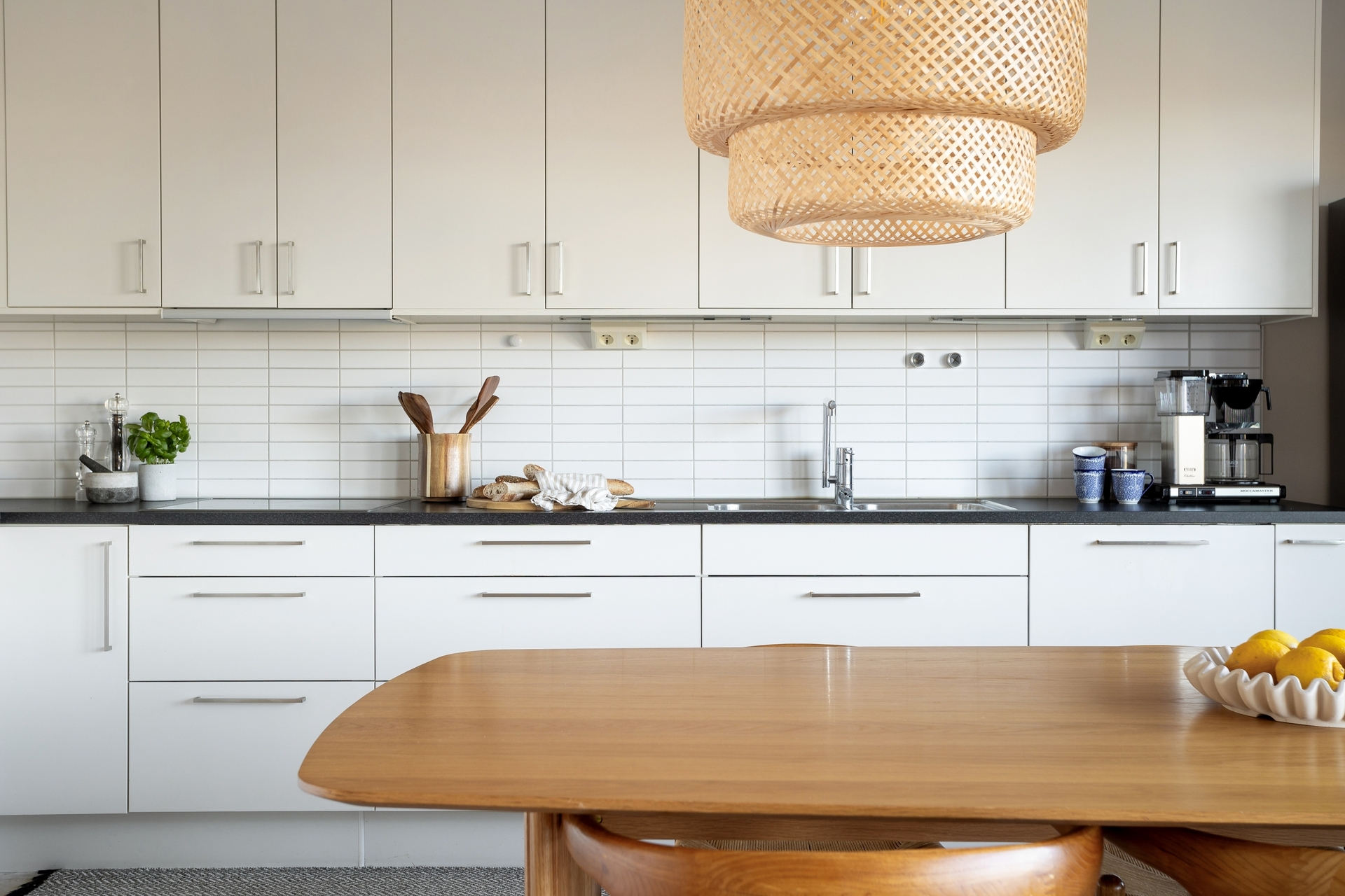 Stilrent kök med vit skåpsinredning och rejäla arbetsytor på mörk laminatskiva med ett vitt kakel ovan. Köket är utrustat med keramikhäll, varmluftsugn, mikro, spisfläkt, integrerad