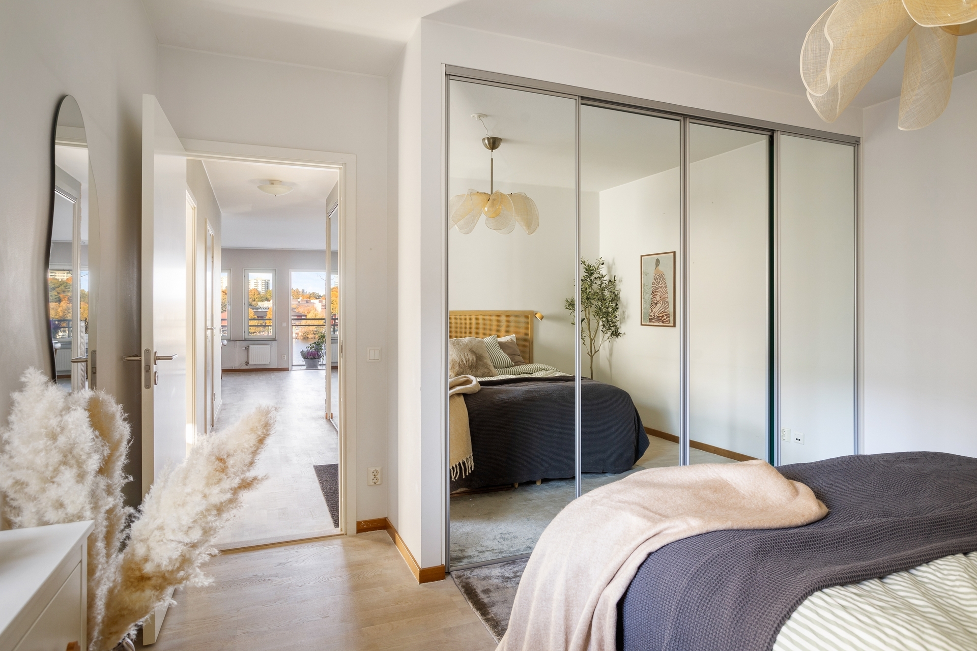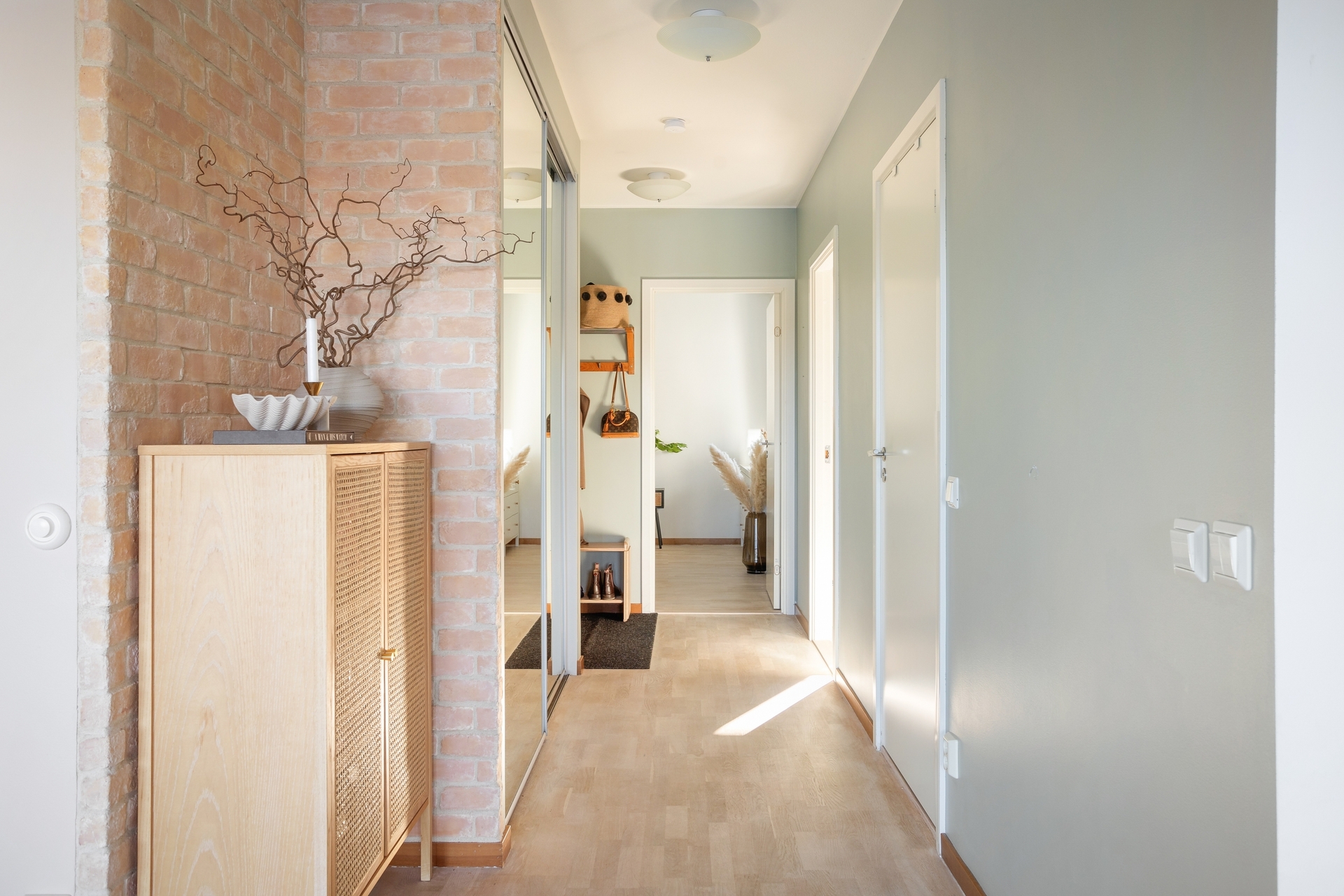 Välkomnande hall hall med avhängningsmöjligheter på hatthylla samt i garderober med spegelskjutdörrar. Väggar är vitmålade och på golvet ligger en praktiskt klinker som sedan övergår till en ekparkett som sträcker sig över resten av lägenheten.