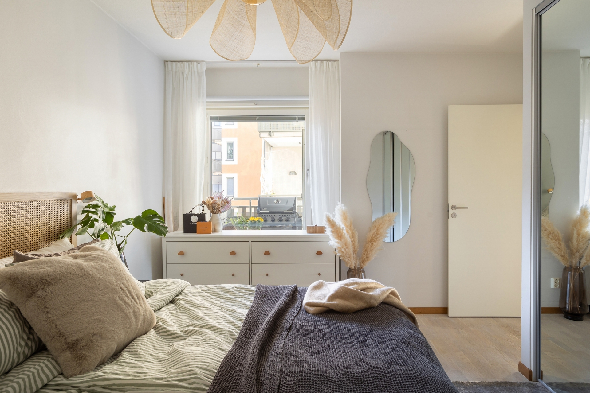 Rymligt sovrum mot föreningens innergård. Plats för större säng och förvaring i garderob. Från rummet nås bostadens andra balkong.