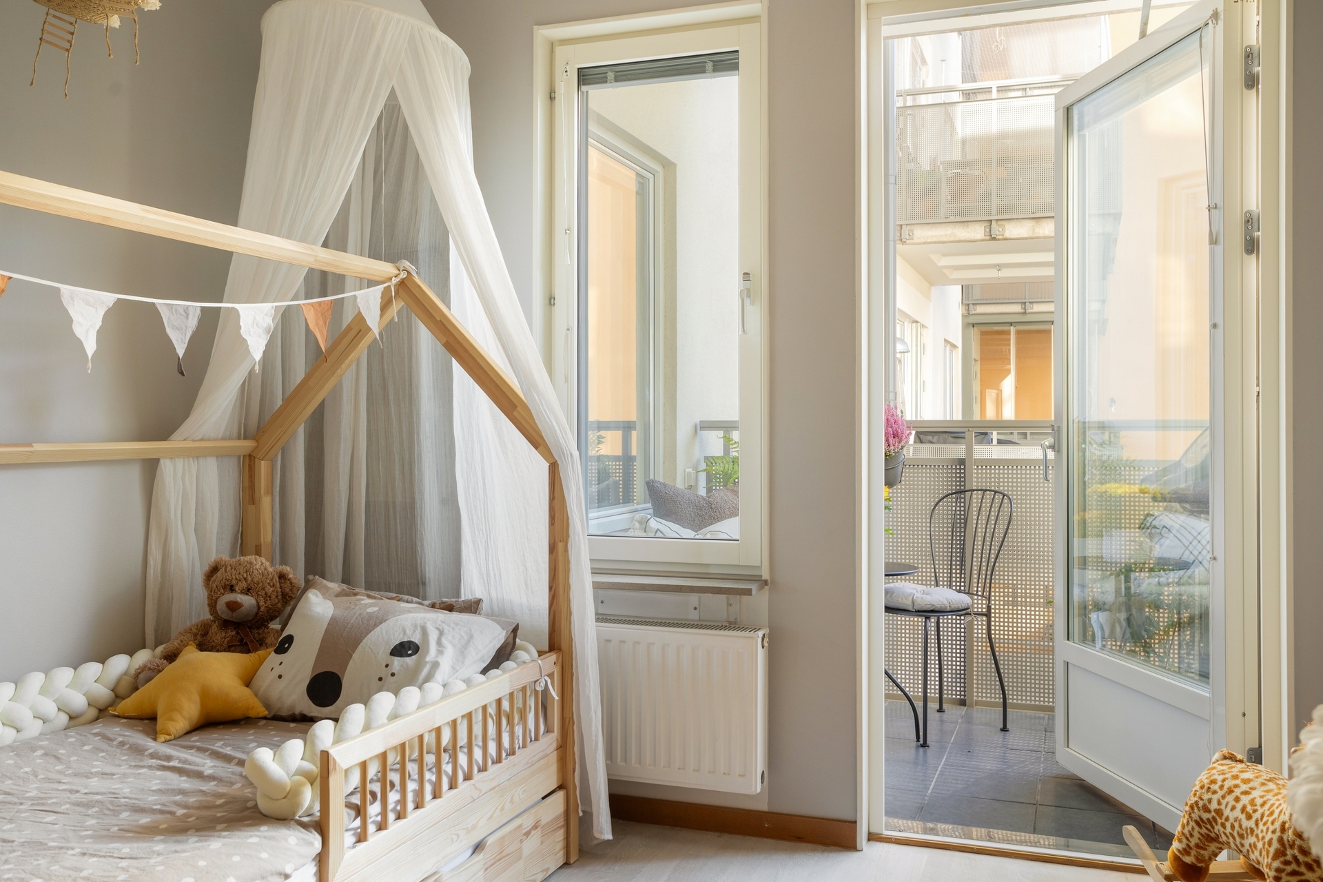 Trevlig balkong med utsikt över föreningens lummiga innergård. Plats för bord, stolar och dina egna odlingar. Här kan du koppla av i eftermiddagssolen.