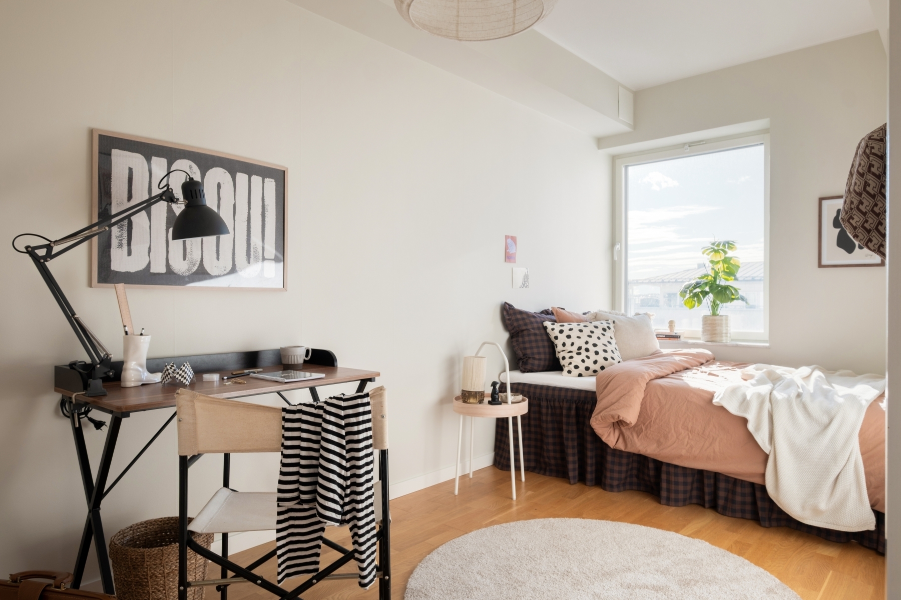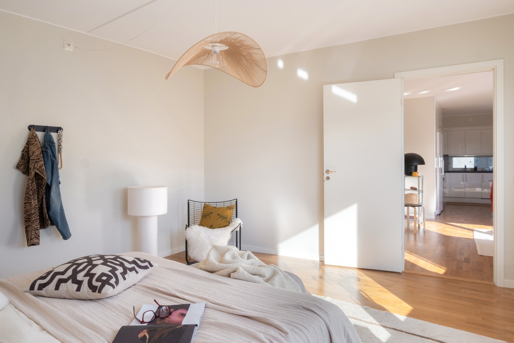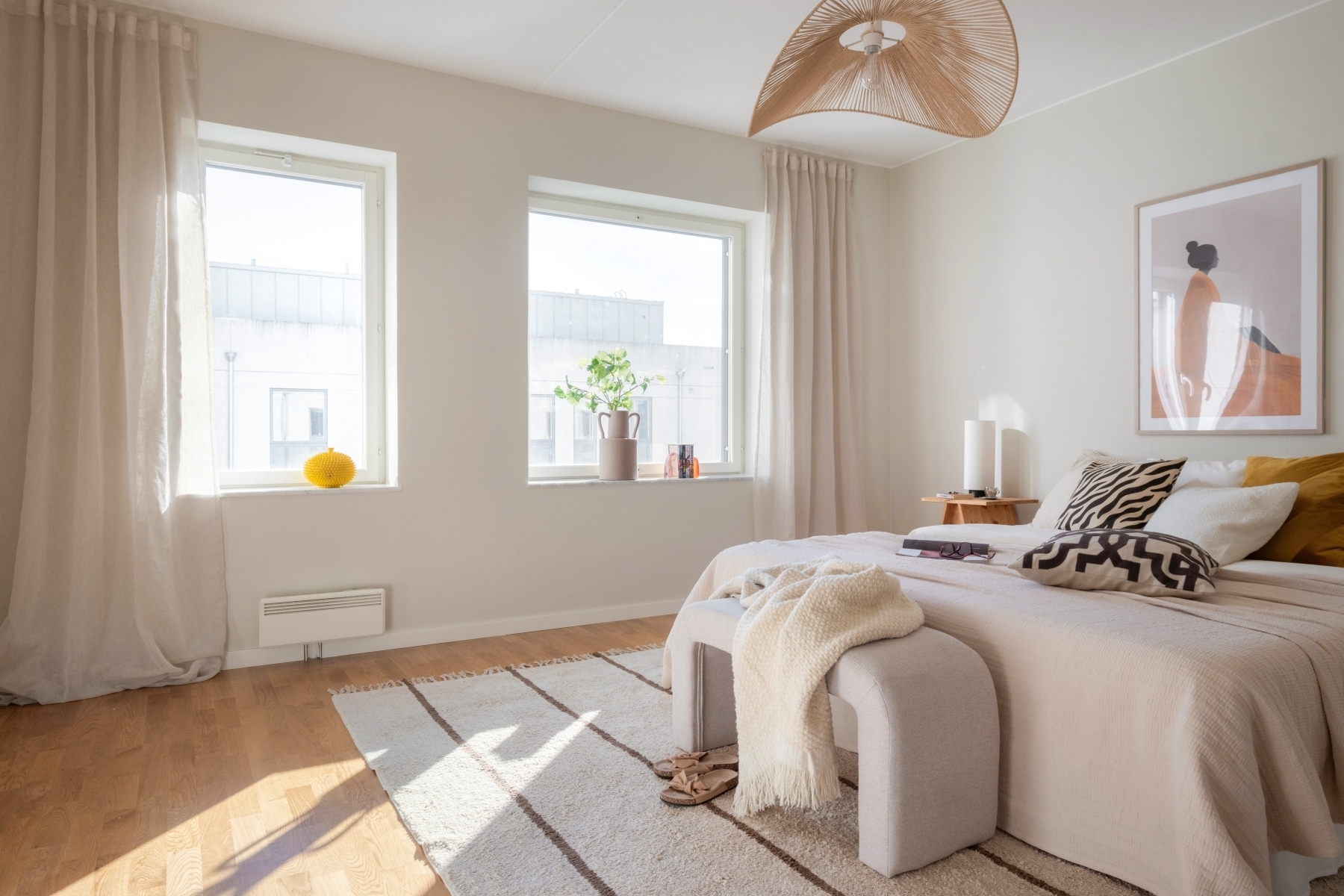 Rofyllt och rymligt sovrum med plats för en stor dubbelsäng och sängbord. Stort fönster ger ett behagligt ljusinsläpp och skapar en ljus och luftig känsla.