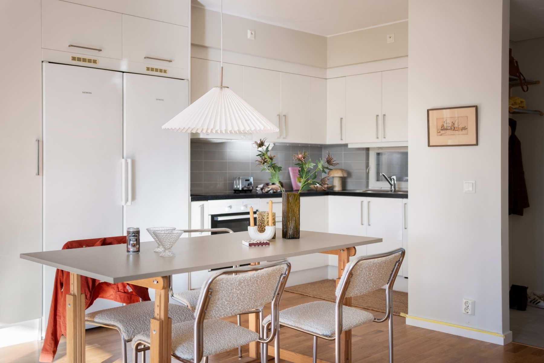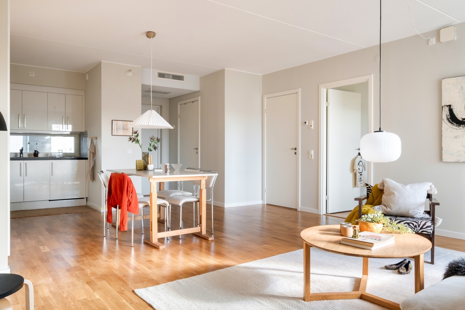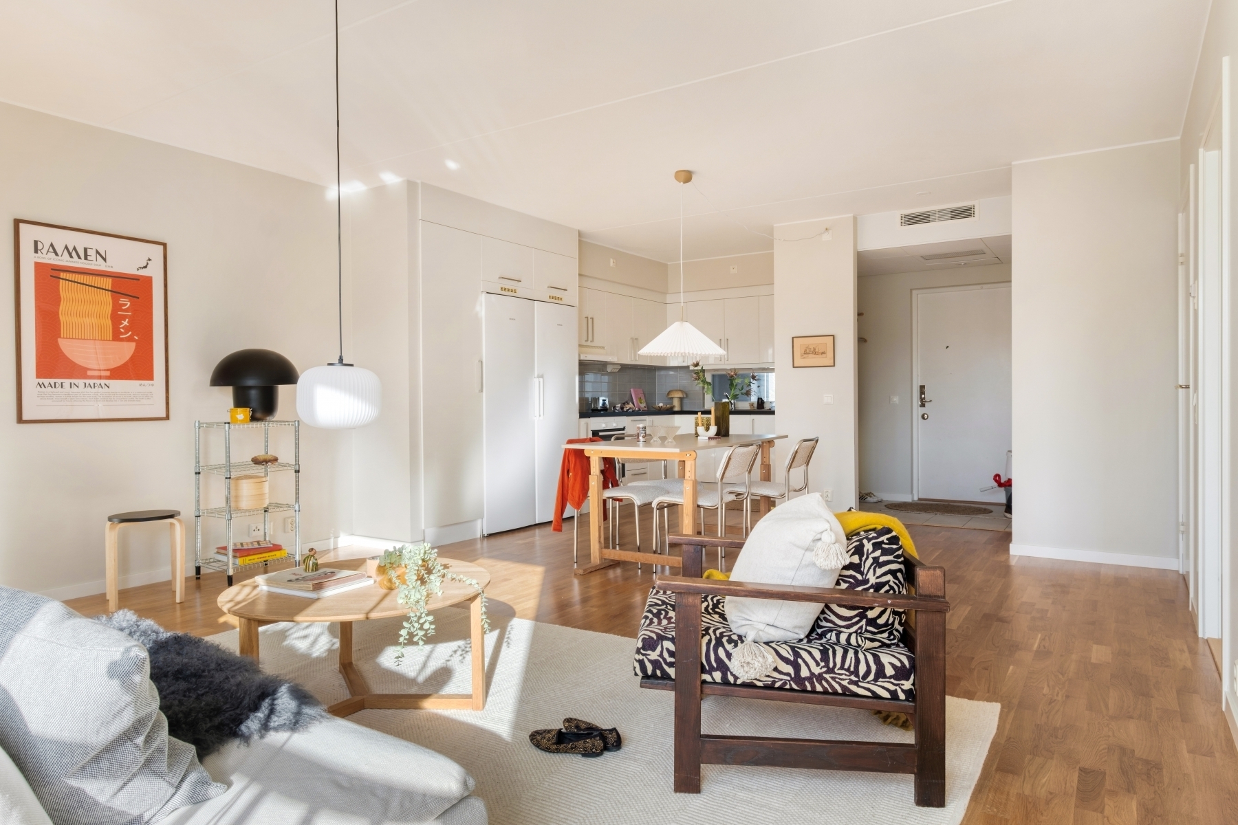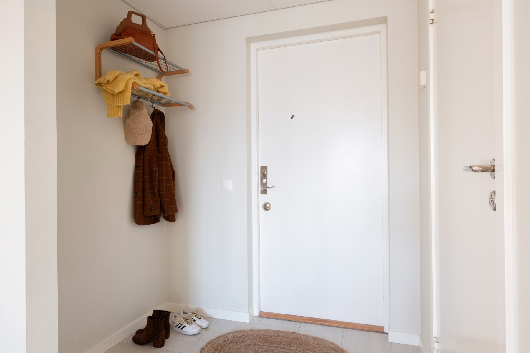 Ljus och funktionell hall med grått klinkergolv som är både praktiskt och lättskött – perfekt för att hantera vardagens slit. Här finns bra förvaring i garderober som ger gott om utrymme för ytterkläder och skor. Klinkergolvet övergår smidigt i en ekparkett som löper vidare genom bostaden och binder samman rummen på ett harmoniskt sätt.