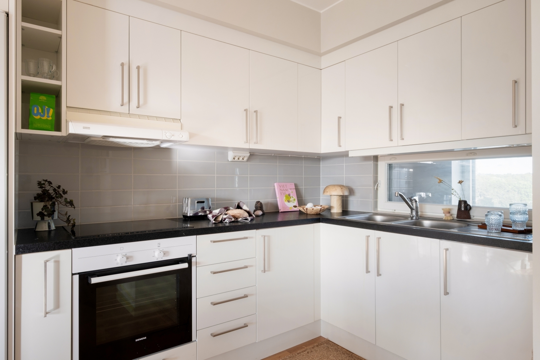 Välplanerat och stilrent kök i vinkel med gott om förvaringsutrymmen bakom vita skåpsluckor. Generösa arbetsytor på en svart laminatskiva ger bra utrymme för matlagning. Köket är utrustat med ugn, spishäll, fläkt samt kyl och frys.