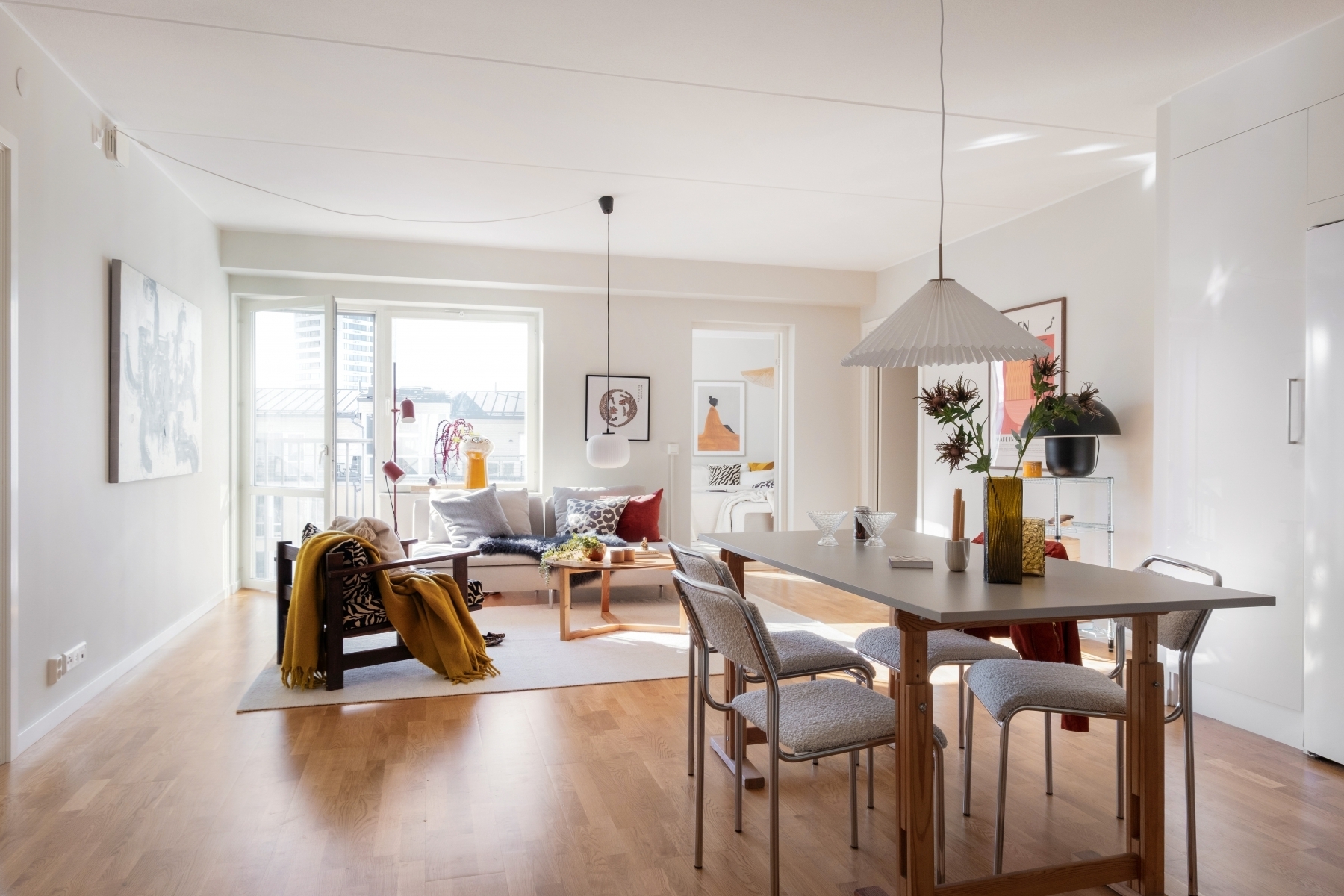 Ljust och trivsamt vardagsrum med stora fönsterpartier som ger ett fint ljusinsläpp och erbjuder utsikt och omgivande takåsar. Rummets generösa ytor ger möjlighet att möblera med både en stor soffgrupp och matbord, vilket skapar en luftig och inbjudande atmosfär – perfekt för såväl vardagens lugna stunder som sociala sammankomster.