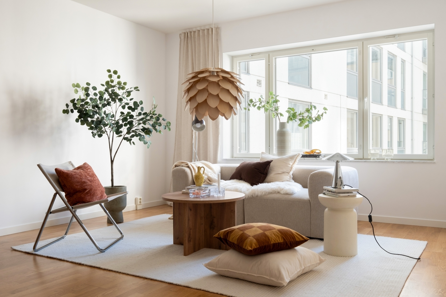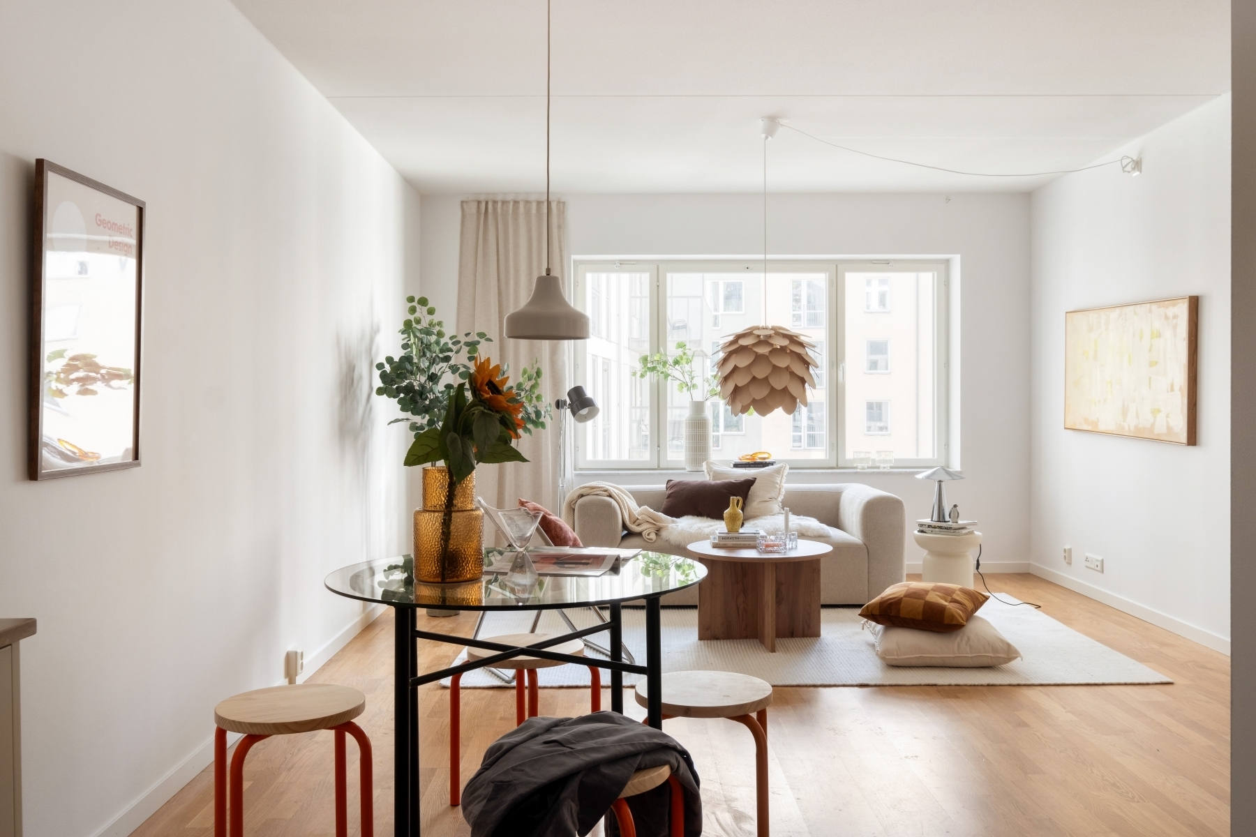 Ljust och trivsamt vardagsrum med stora fönsterpartier som ger ett fint ljusinsläpp och erbjuder utsikt över innergården. Rummets generösa ytor ger möjlighet att möblera med både en stor soffgrupp och matbord, vilket skapar en luftig och inbjudande atmosfär – perfekt för såväl vardagens lugna stunder som sociala sammankomster.