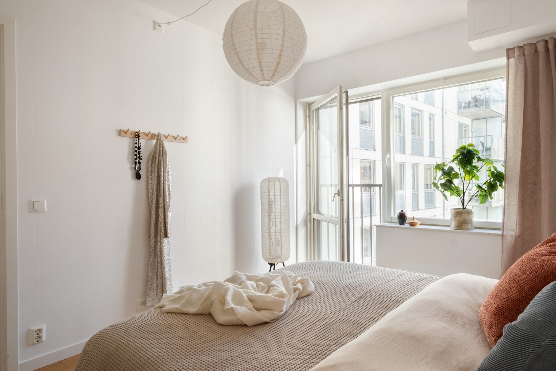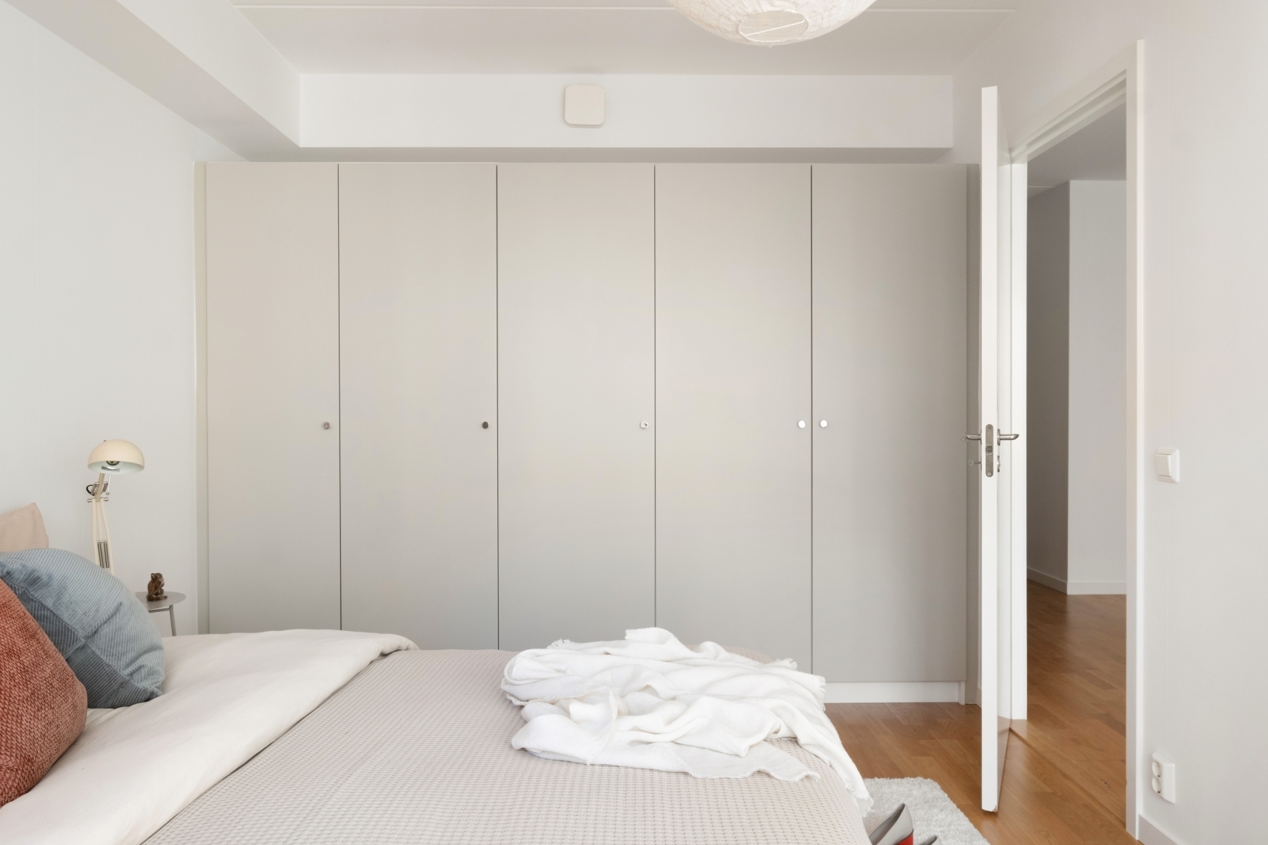 Ett rofyllt och generöst sovrum som bjuder in till avkoppling. Här finns gott om plats för en stor dubbelsäng med tillhörande sängbord, och det stora glaspartiet släpper in ett mjukt och behagligt ljus som ger rummet en luftig och harmonisk känsla. De stilrena garderoberna, som är i linje med bostadens övriga snickerier, erbjuder gott om förvaring och hjälper till att skapa en organiserad miljö. En perfekt plats att dra sig tillbaka till för en god natts sömn eller en lång, avkopplande morgon.