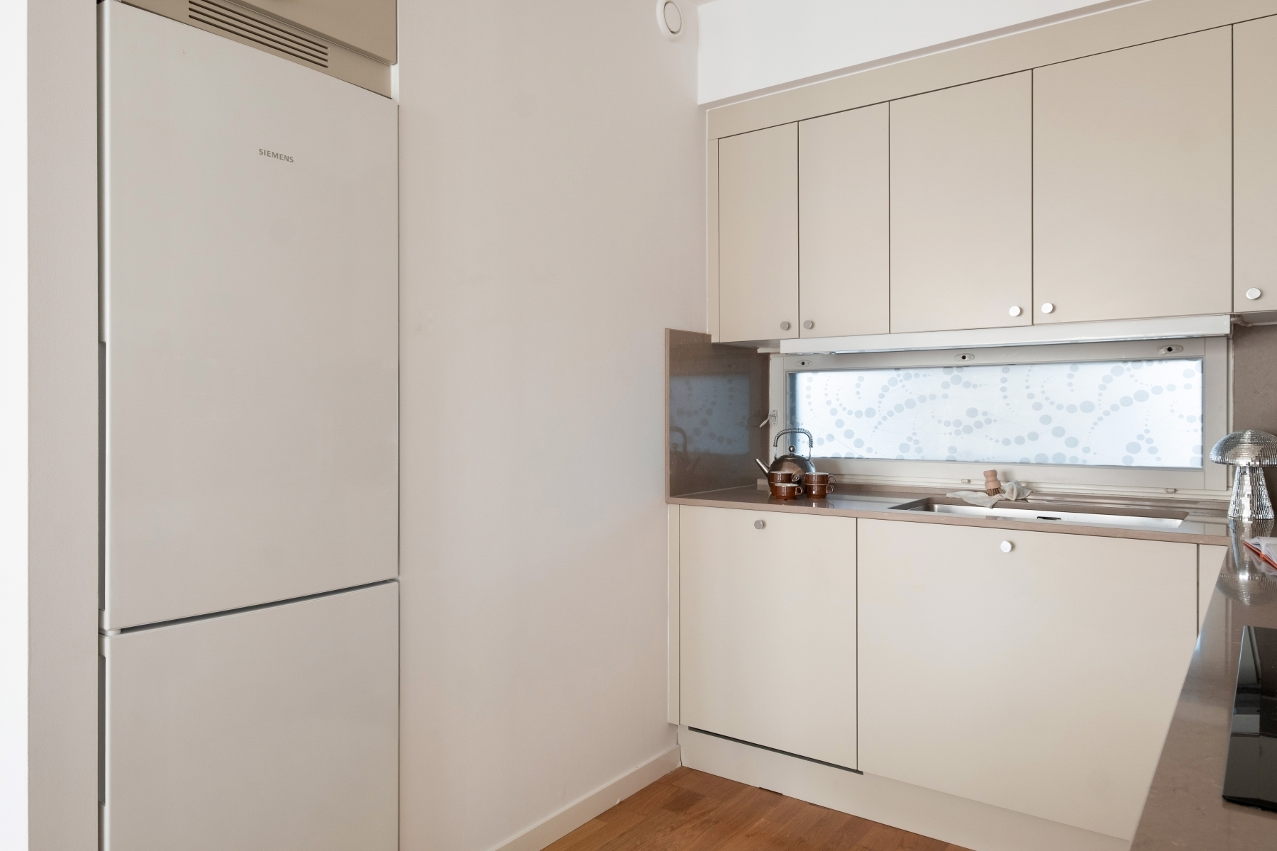 Ett smakfullt designat kök i vinkel med generösa förvaringsmöjligheter bakom eleganta sandfärgade skåpsluckor, stilfullt kompletterade med kromade knoppar. Den gedigna bänkskivan i kvartsitkomposit (Silestone) sträcker sig upp längs väggen som en dekorativ list och harmonierar vackert med det enhetliga stänkskyddet. Köket är fullt utrustat med ugn, spishäll, fläktkåpa, diskmaskin samt en kombinerad kyl och frys – allt för en smidig matlagning i en stilfull miljö.
