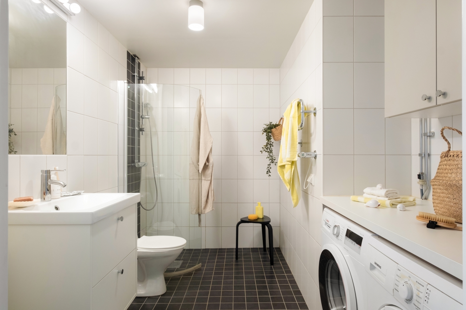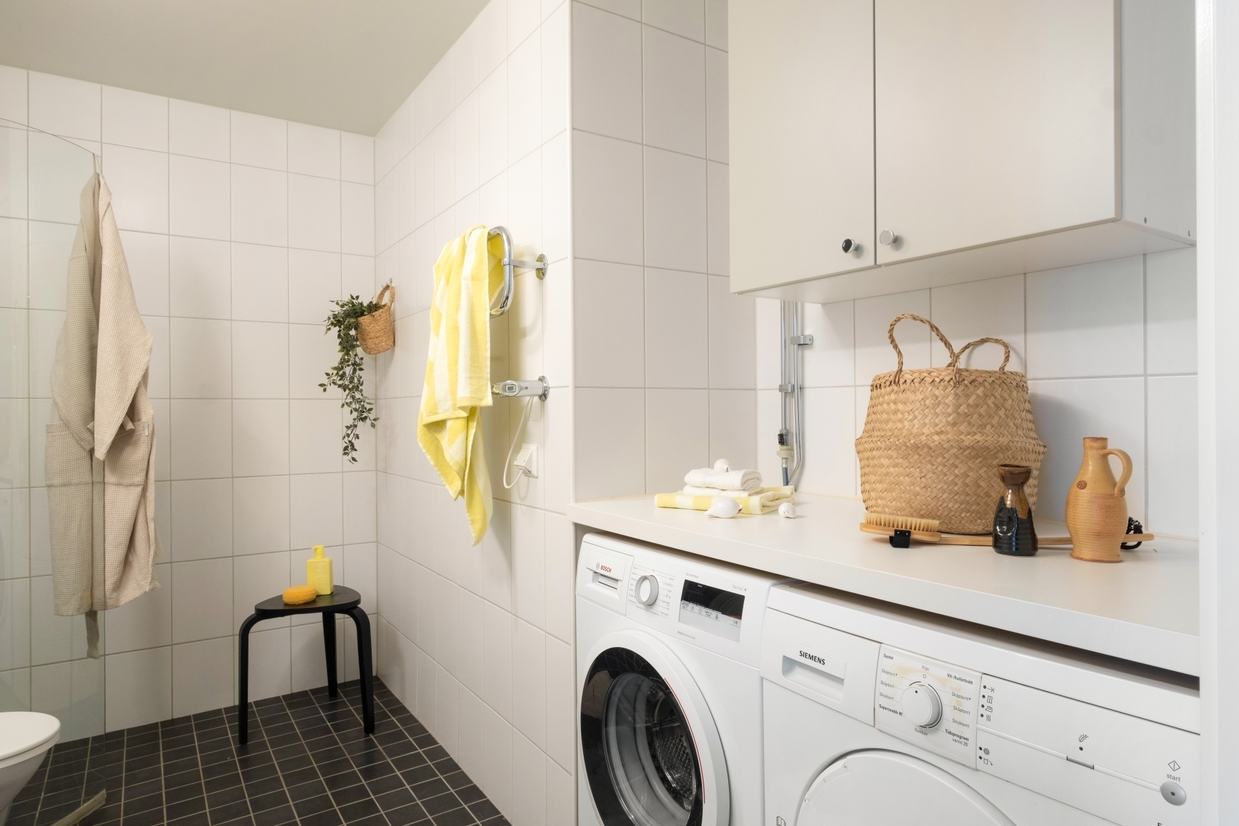 Välplanerat och stilrent badrum med vita helkaklade väggar och mörkt klinkergolv med golvvärme för extra komfort. Här finns en rymlig dusch med glasvägg, toalett, handdukstork samt handfat. Tvättdelen är utrustad med både tvättmaskin och torktumlare, placerade under en bänkskiva som ger goda avlastningsytor. Ovanför finns överskåp för ytterligare förvaring av exempelvis handdukar och tvättmedel.