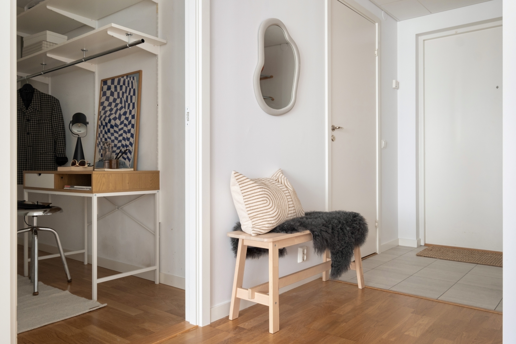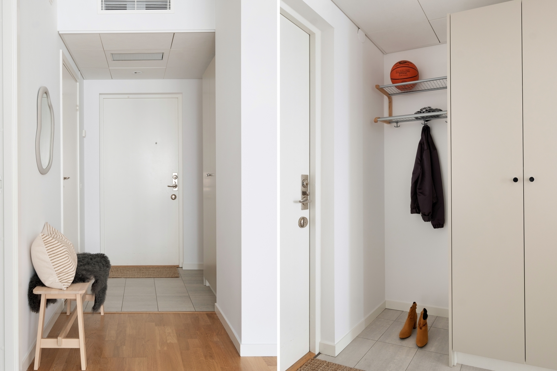 Välkomnande hall med ett praktiskt och slitstarkt klinkergolv i elegant grå nyans, perfekt för att hantera vardagens slitage. Här finns gott om plats för ytterkläder, med både en hatthylla och stilrena garderober som smälter in i interiören. Klinkergolvet övergår sedan till en vitlaserad ekparkett som sträcker sig vidare genom bostaden och skapar en enhetlig och ljus atmosfär.