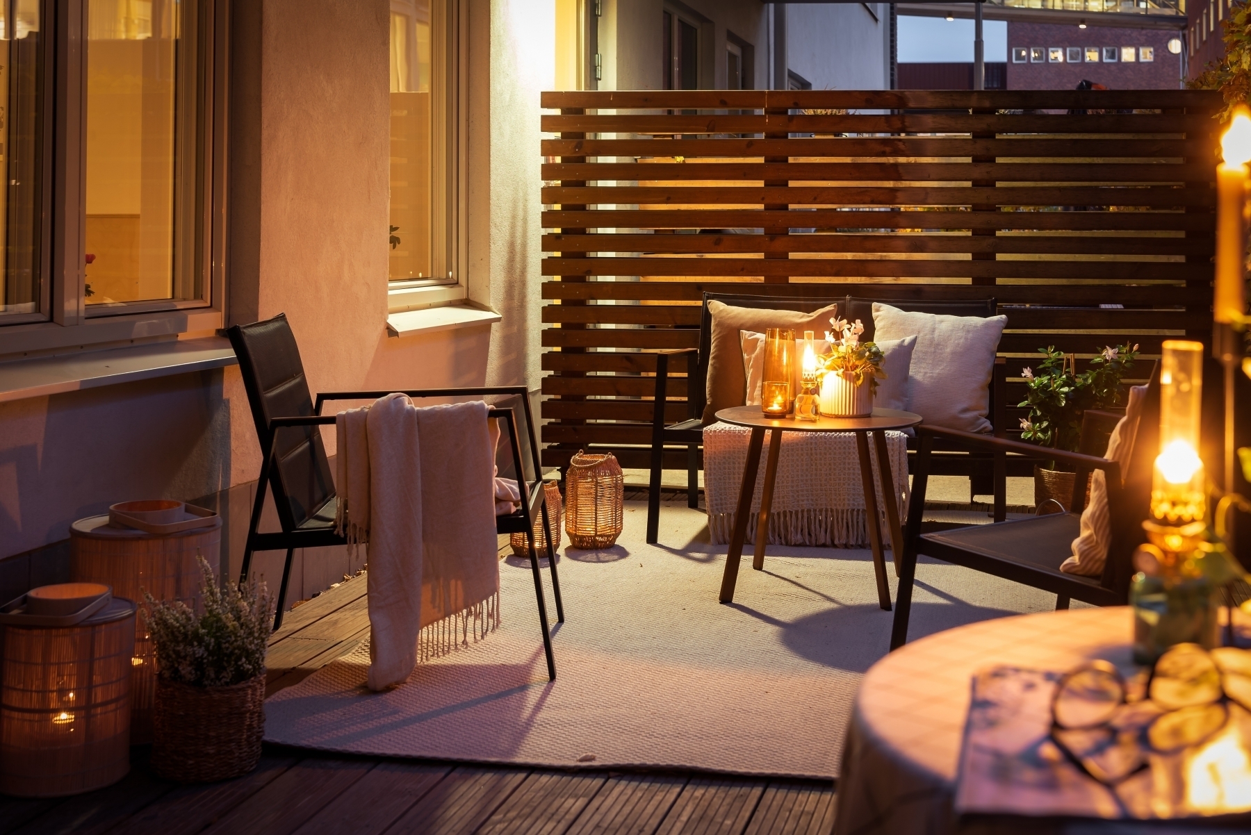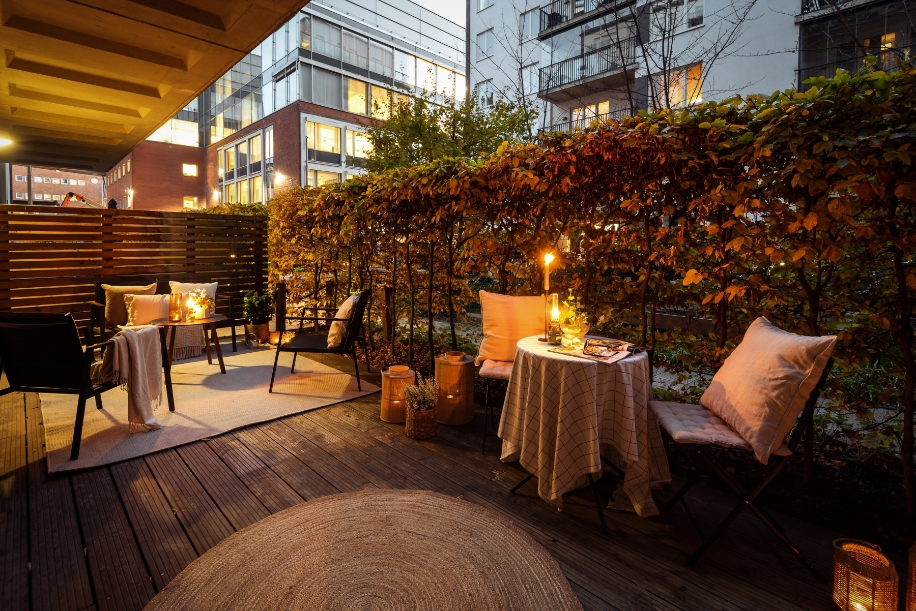 Direkt utanför vardagsrum och kök breder en rymlig uteplats ut sig – en perfekt miljö för middagar med vänner och familj, eller avkopplande stunder i eftermiddagssolen.