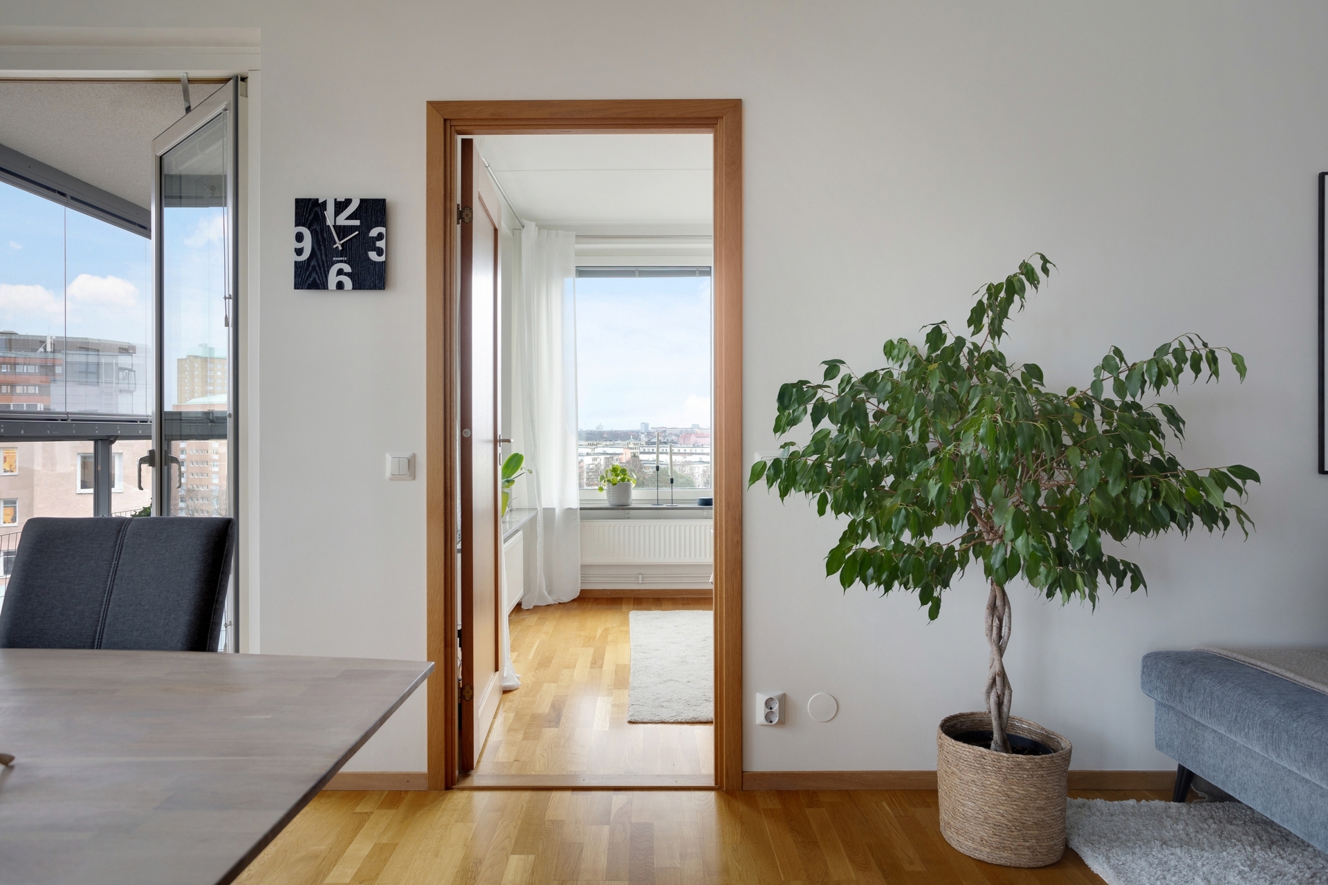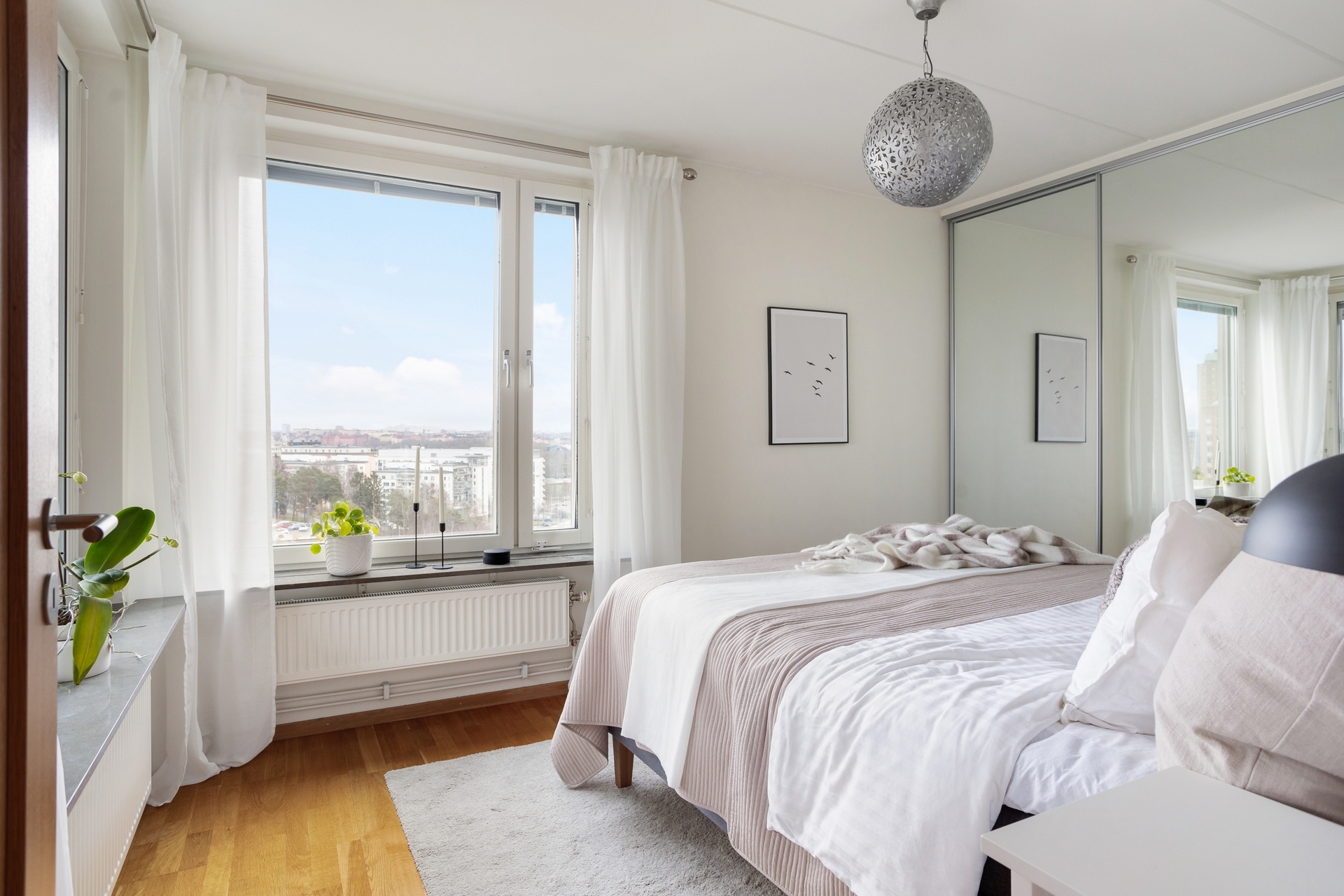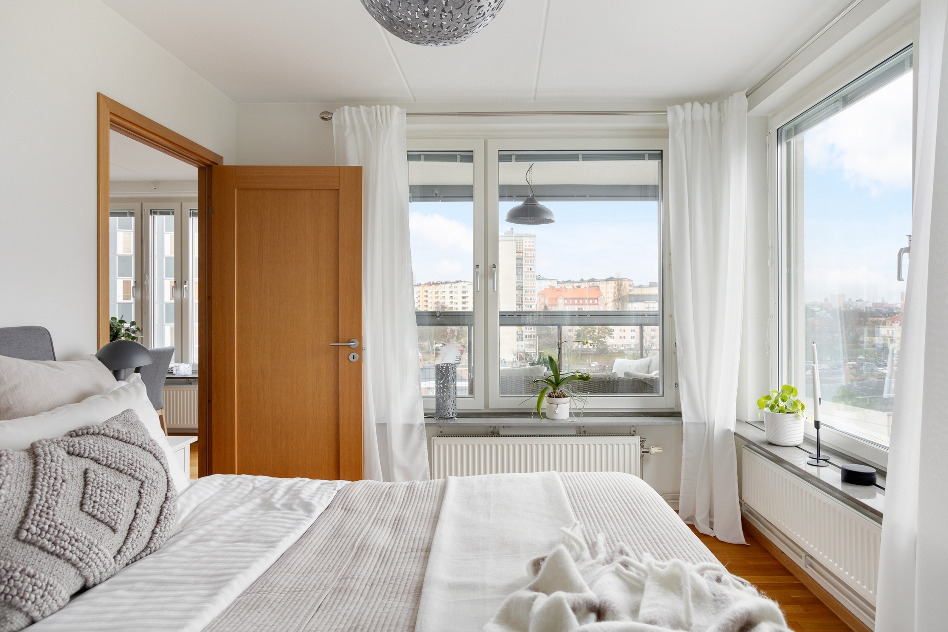 Högt upp i huset, walk-in-closet och solig inglasad balkong i väst.
