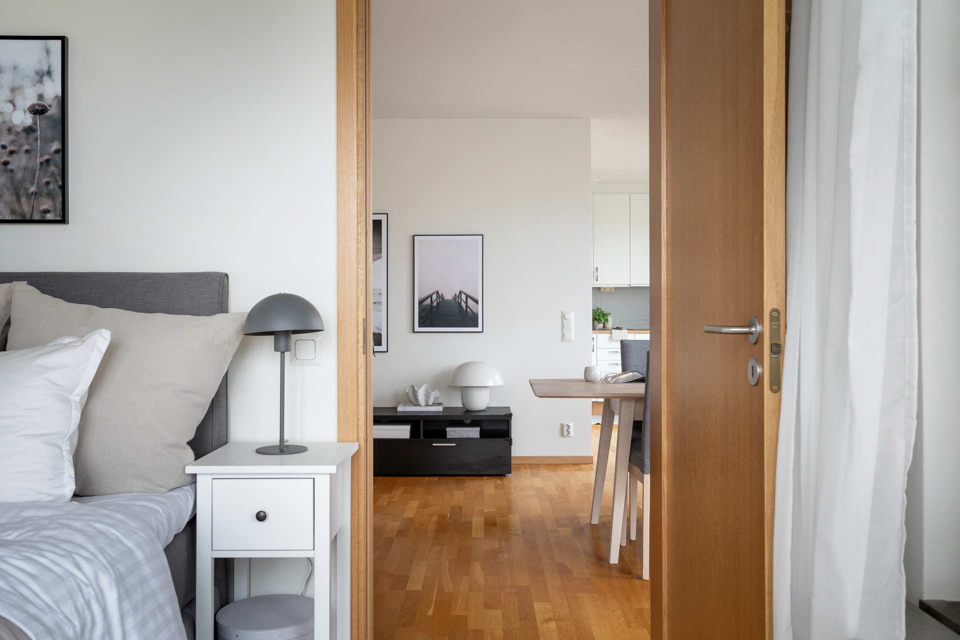 Dubbla balkonger, sjöglimt, 2,60 m i tak och plats för köksö i köket.