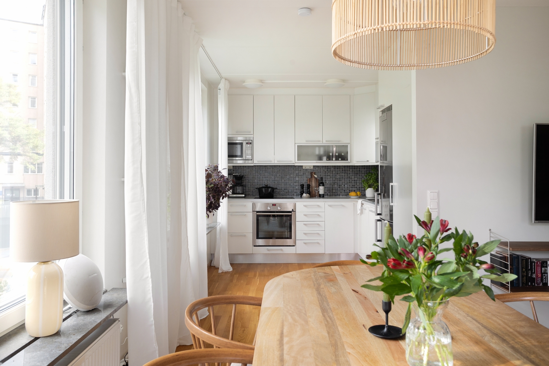 Dubbla balkonger, sjöglimt, 2,60 m i tak och plats för köksö i köket.