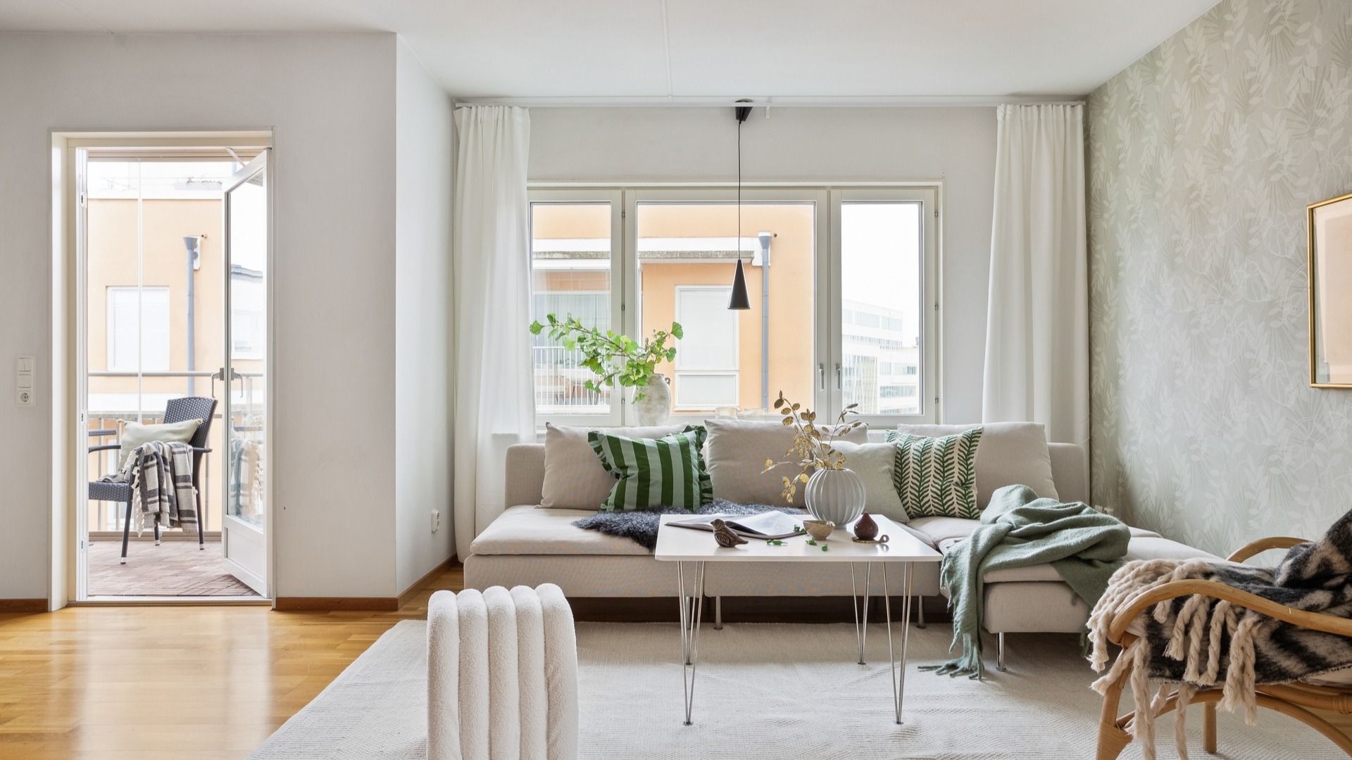 Snygg interiör och generös söderbalkong mot innergården.