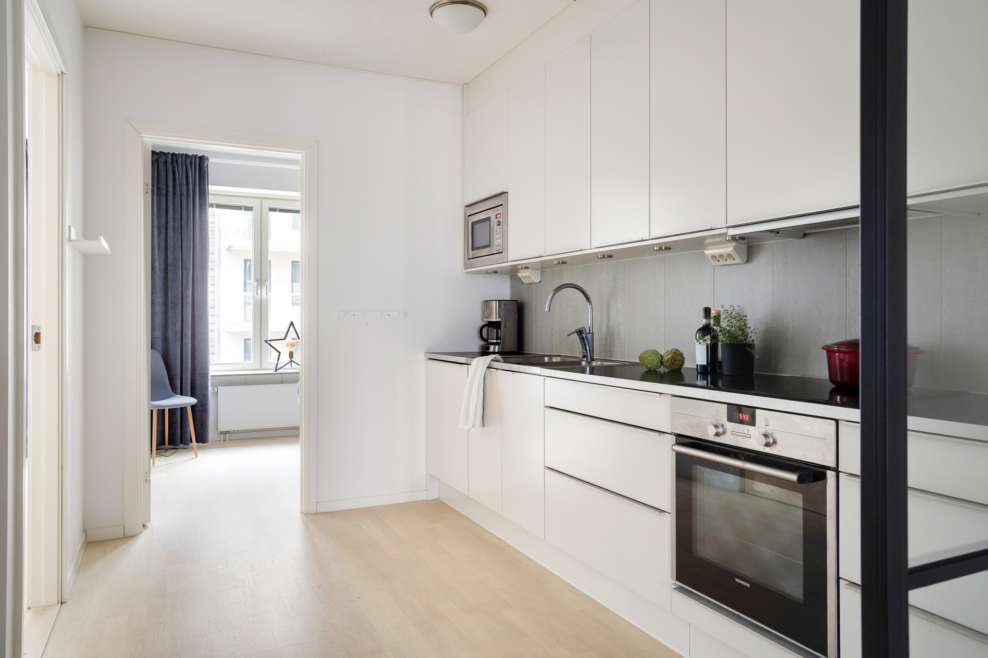 Välplanerad gavel-3:a med stor inglasad balkong och eftermiddagssol på vån 12.