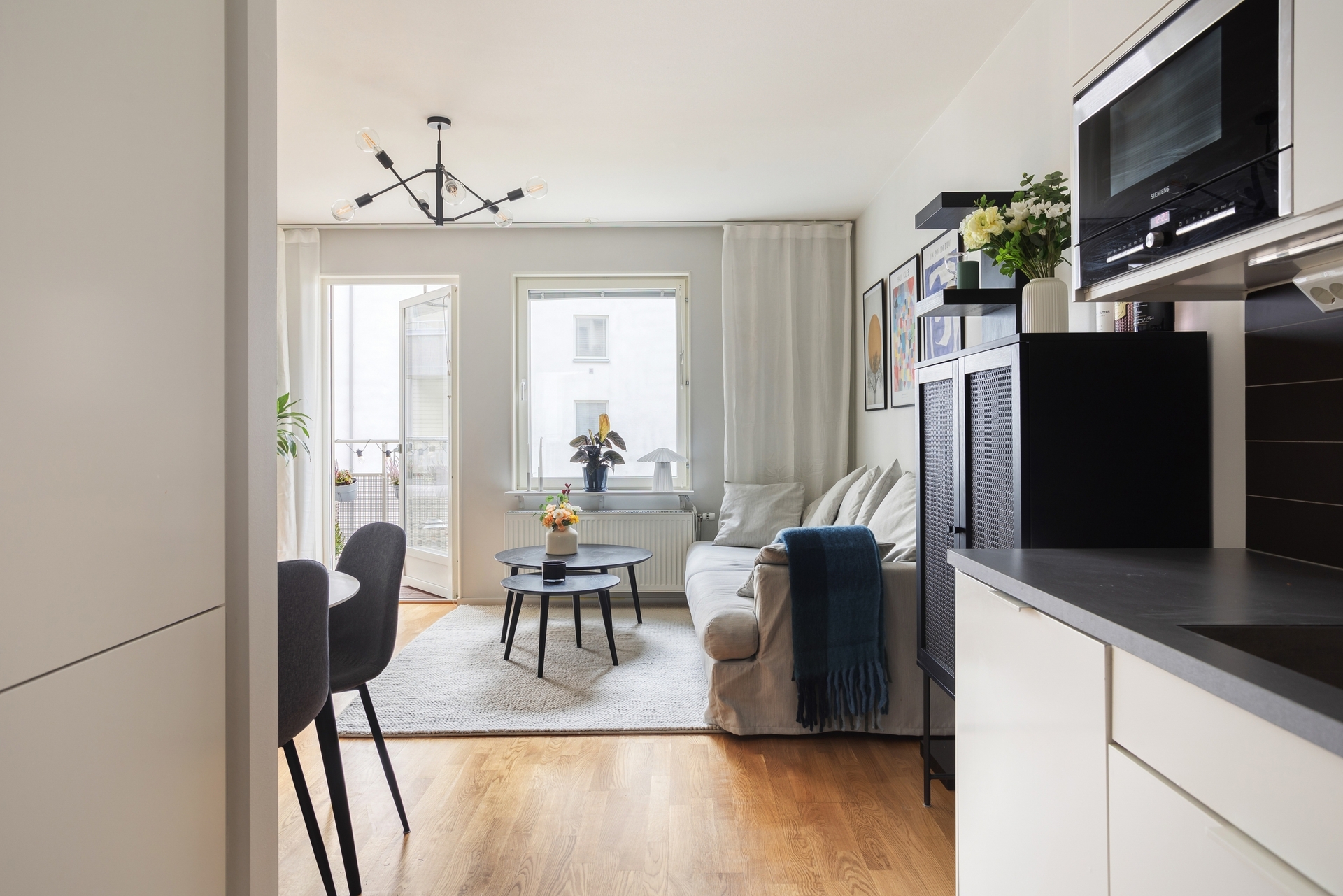 Högt läge, solig inglasad balkong och stilfullt renoverat kök – ett hem att trivas i!