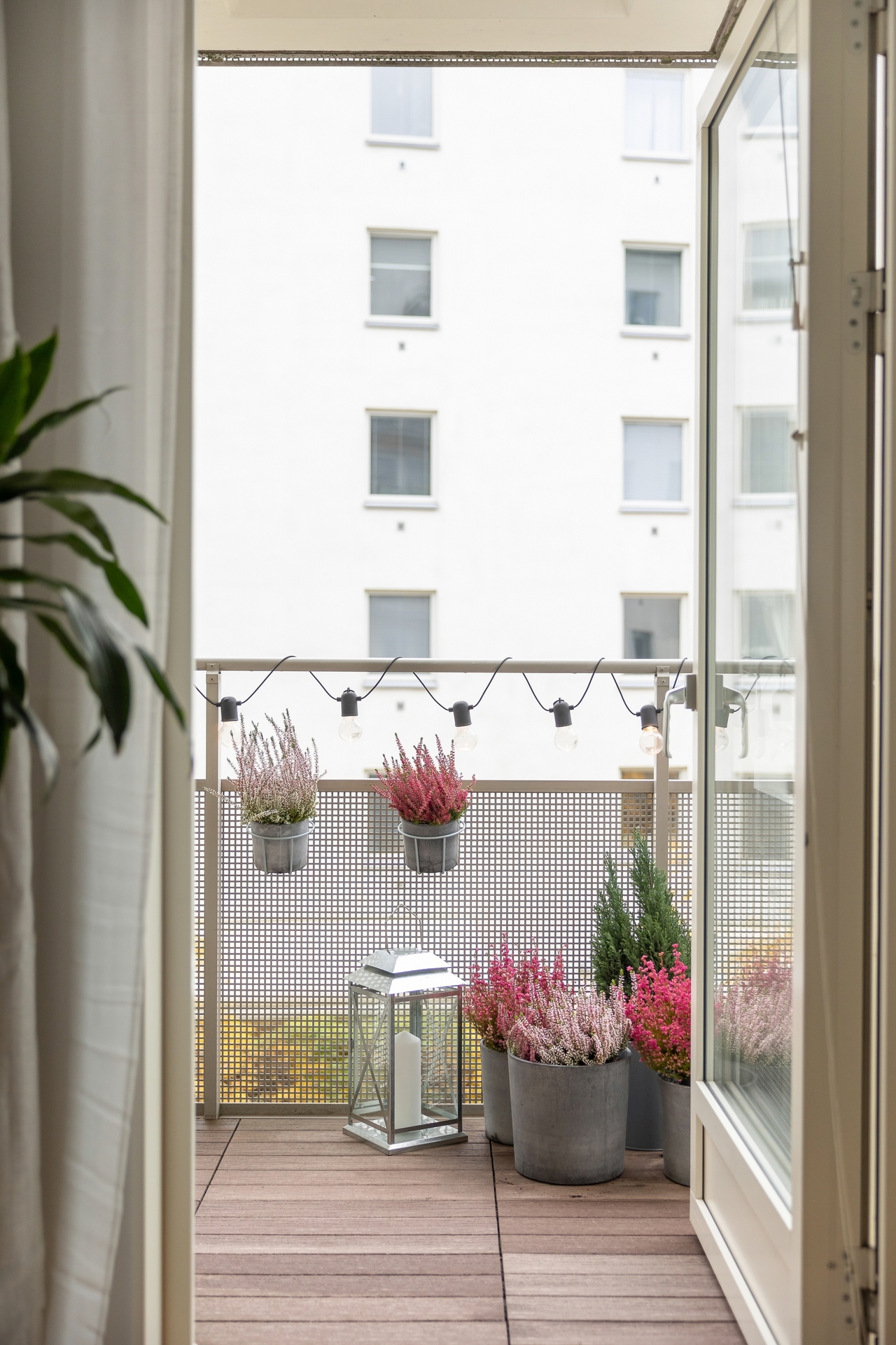 Välplanerad gavel-3:a med stor inglasad balkong och eftermiddagssol på vån 12.