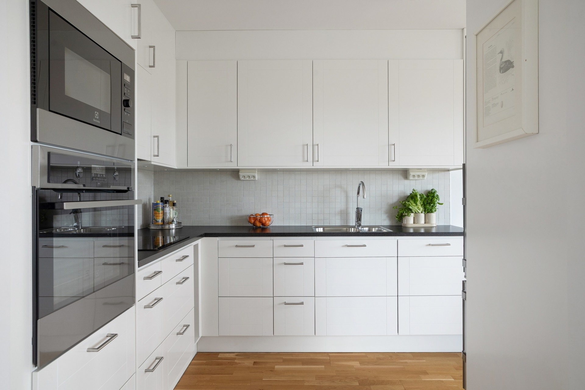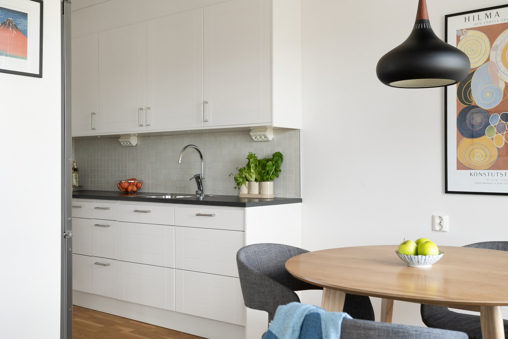 Inspirerande kök med delvis öppen planlösning mot bostadens sociala ytor. Köket erbjuder bra förvaring bakom vita luckor och har goda arbetsytor på parktiskt bänkskiva i laminat, ljust kakel ovan arbetsytorna samt infälld belysning i underskåpen som ger både funktion och trivsel. Utrustningen består av induktionshäll, spisfläkt, inbyggnadsugn, inbyggnadsmicro, kyl/frys samt integrerad diskmaskin. Intill fönstret finns en trevlig matplats med grönskande utsikt – en naturlig plats för både vardagsmåltider och sociala middagar.