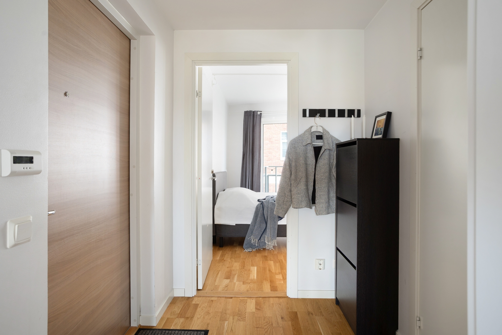 Välkomnande hall med goda möjligheter till avhängning av ytterkläder och skor. Här finns även en garderob för extra förvaring. Säkerhetsdörren ger en trygg entré till bostaden och golvet är belagt med en vacker ekparkett som sträcker sig över vidare in i bostaden .