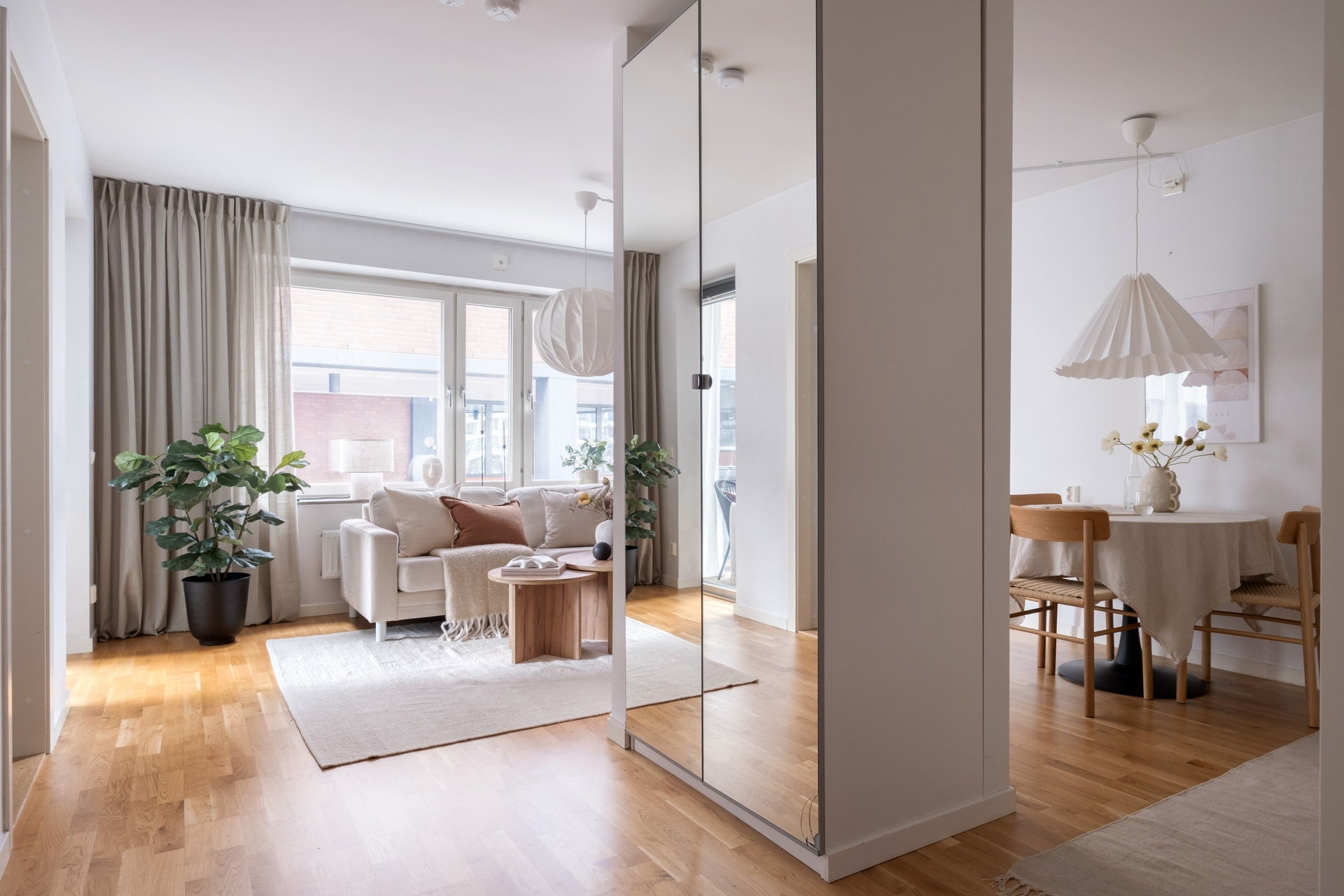 Välkomnande hall med gott om plats för både ytterkläder och skor. Här finns utrymme för klädhängare samt förvaring i två garderober med spegeldörrar. Den genomgående ekparketten binder ihop bostaden på ett smakfullt sätt, medan de ljusa väggarna bidrar till ett luftigt och fräscht intryck.