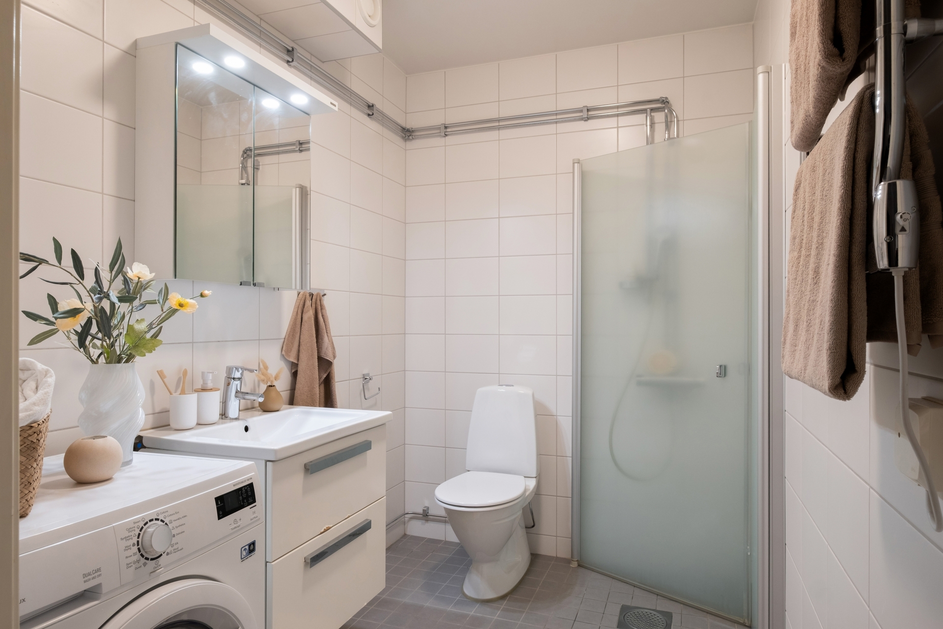 Modernt och rymligt badrum med smakfulla materialval. Grått klinkergolv med golvvärme kombineras med vitkaklade väggar– en tidlös och stilren kombination. Här finns kommod med handfat, spegelskåp med belysning, toalett samt dusch. En kombinerad tvätt- och torkmaskin gör vardagen extra smidig.