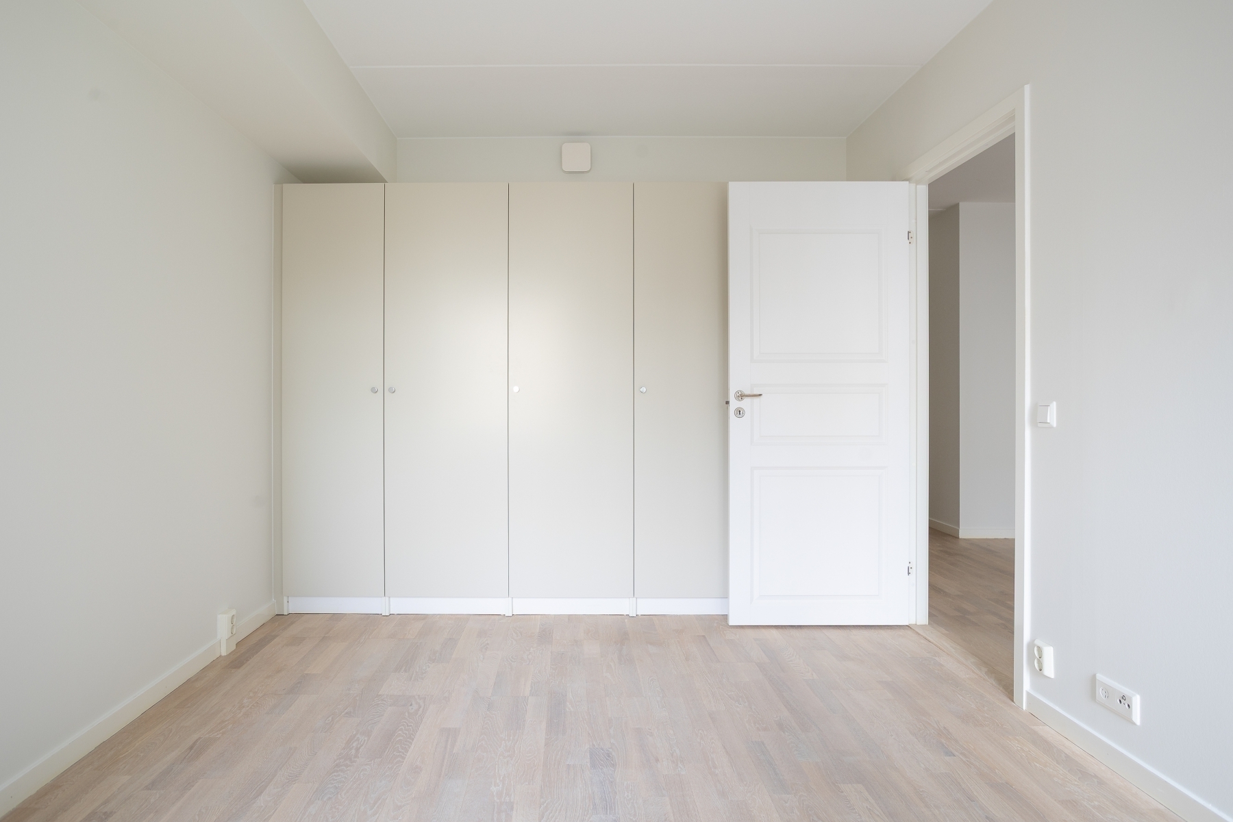 Ett rofyllt och generöst sovrum som bjuder in till avkoppling. Här finns gott om plats för en stor dubbelsäng med tillhörande sängbord, och det stora glaspartiet släpper in ett mjukt och behagligt ljus som ger rummet en luftig och harmonisk känsla. De stilrena garderoberna, som är i linje med bostadens övriga snickerier, erbjuder gott om förvaring och hjälper till att skapa en organiserad miljö. En perfekt plats att dra sig tillbaka till för en god natts sömn eller en lång, avkopplande morgon.
