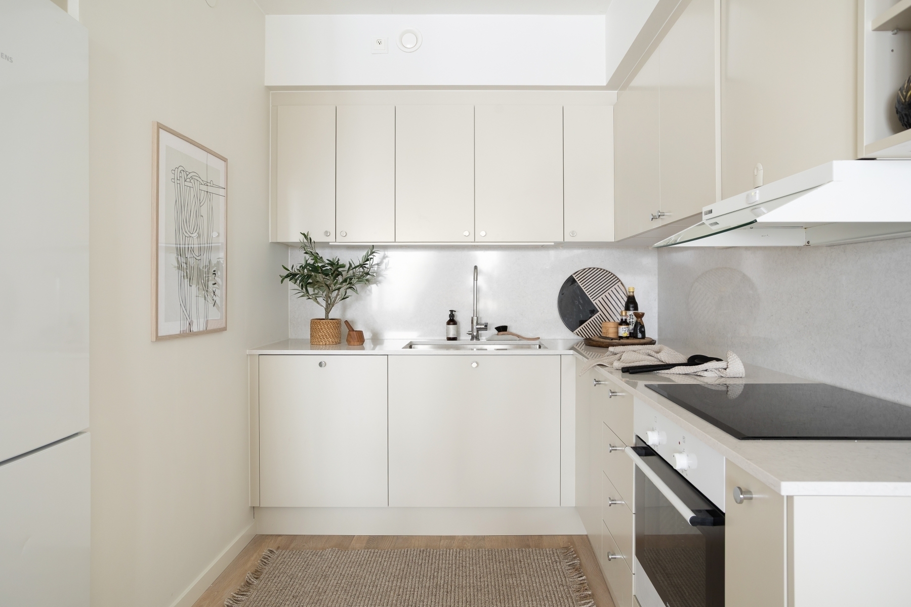 Ett smakfullt designat och nyrenoverat kök med generösa förvaringsmöjligheter bakom eleganta ljusa skåpsluckor, stilfullt kompletterade med kromade knoppar. Den gedigna bänkskivan i kvartskomposit (Silestone) harmonierar vackert med backsplasch i kvartskomposit. Köket är fullt utrustat med ugn, häll, fläkt, integrerad diskmaskin samt kyl/frys, allt för en smidig matlagning i en stilfull miljö.