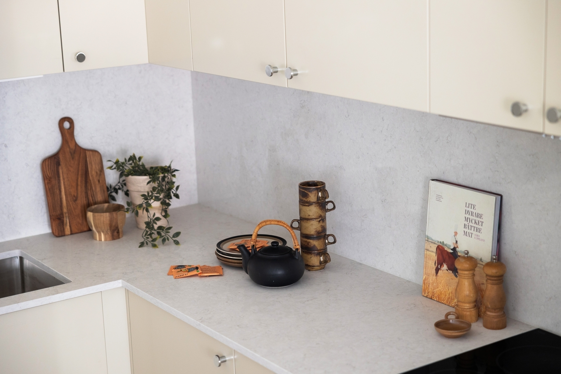 Ett smakfullt designat och nyrenoverat kök med generösa förvaringsmöjligheter bakom eleganta ljusa skåpsluckor, stilfullt kompletterade med kromade knoppar. Den gedigna bänkskivan i kvartskomposit (Silestone) harmonierar vackert med backsplasch i kvartskomposit. Köket är fullt utrustat med ugn, häll, fläkt, diskmaskin samt kyl och frys - allt för en smidig matlagning i en stilfull miljö.
