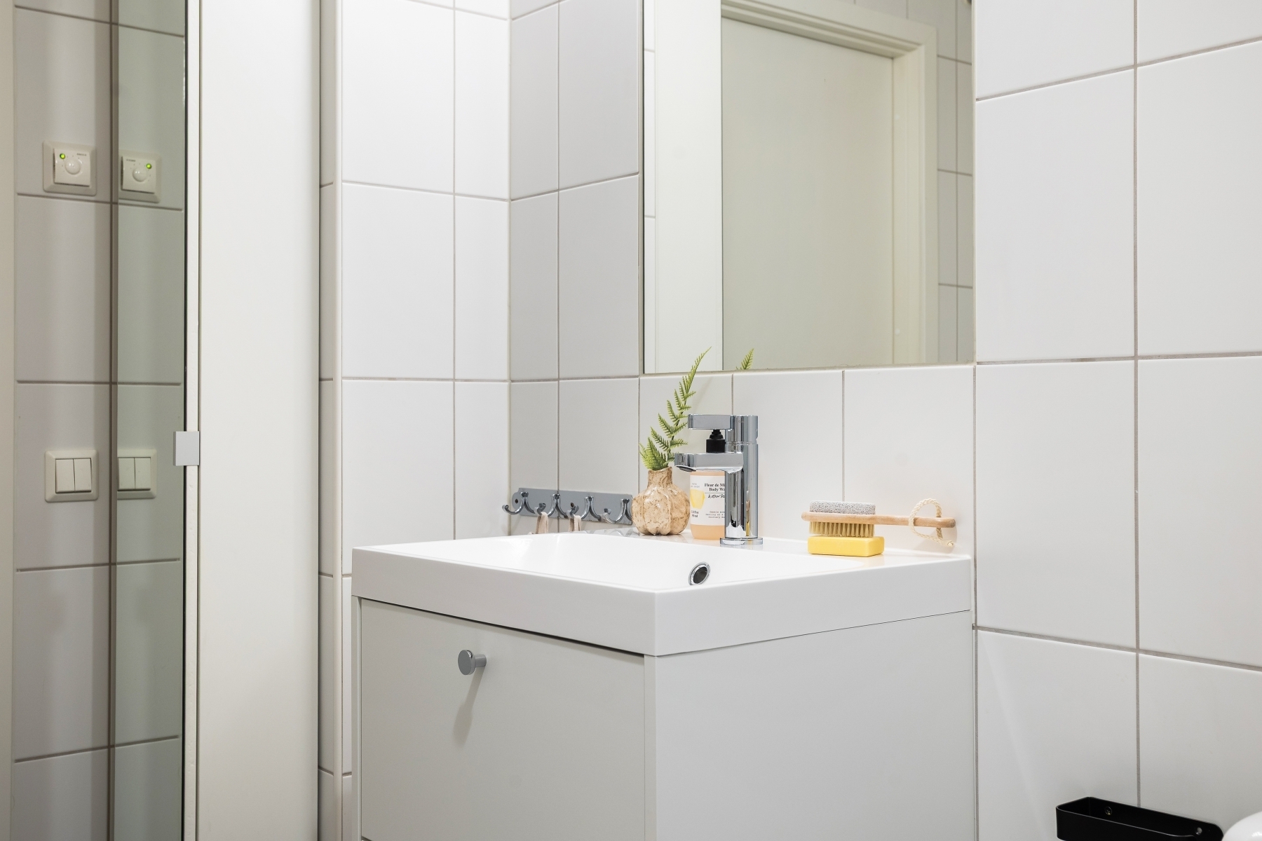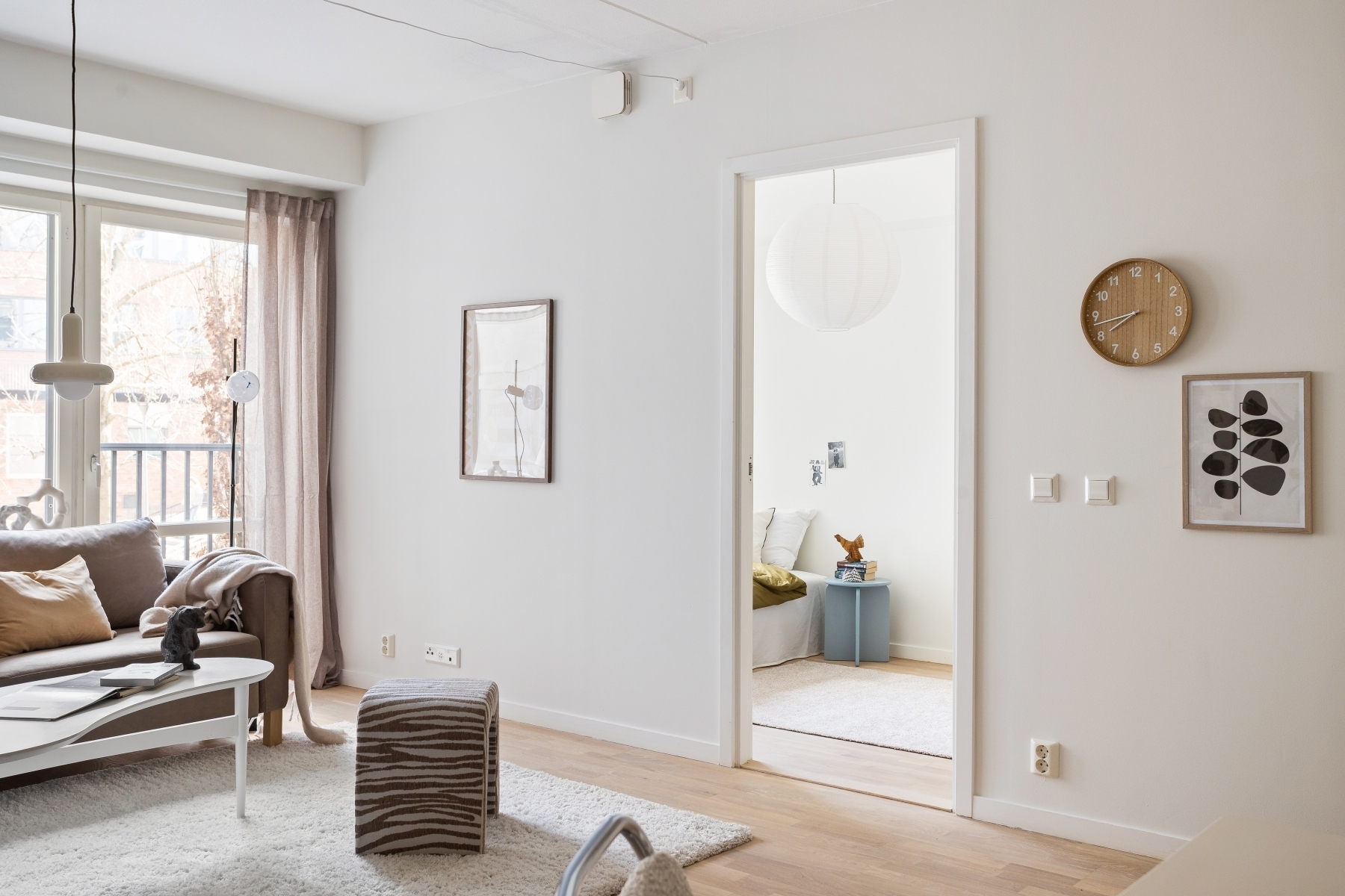 Välkomnande hall med ett praktiskt och slitstarkt klinkergolv i elegant ljus nyans, perfekt för att hantera vardagens slitage. Här finns gott om plats för ytterkläder, med både en hatthylla och stilren garderob som smälter in i interiören. Klinkergolvet övergår sedan till en vitlaserad ekparkett som sträcker sig vidare genom bostaden och skapar en enhetlig och ljus atmosfär.