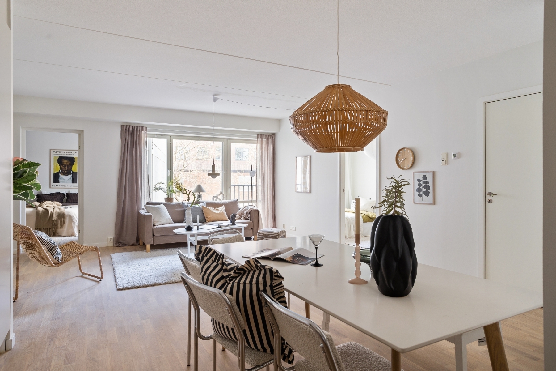 Ett fantastiskt vardagsrum med generösa ytor som skapar en luftig och inbjudande känsla, perfekt för både avkoppling och sociala tillställningar. Rummet har gott om plats för en större soffgrupp där du kan sjunka ner och njuta av lugnet, samt ett rymligt matbord för trevliga middagar med familj och vänner.