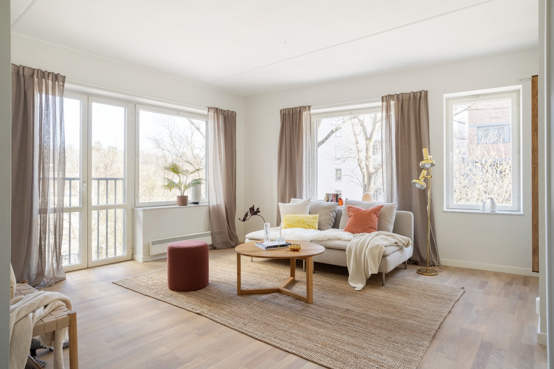 Ett fantastiskt vardagsrum i gavelläge med stora fönsterpartier i två väderstreck som släpper in ett flödande ljus och framhäver rummets unika rymd och öppenhet. Här erbjuds generösa sällskapsytor där ljuset står i centrum och skapar en inbjudande atmosfär. Den öppna planlösningen ger flexibilitet i möbleringen, med gott om plats för en soffgrupp för avkoppling eller sociala tillställningar.