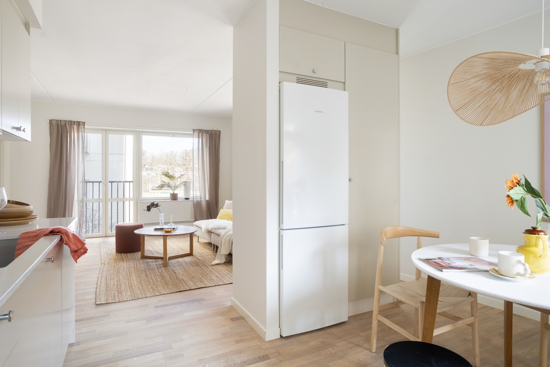 Ett smakfullt designat kök med generösa förvaringsmöjligheter bakom eleganta beige skåpsluckor, stilfullt kompletterade med kromade knoppar. Den gedigna bänkskivan i kvartskomposit (Silestone) harmonierar vackert med backsplasch i kvartskomposit. Köket är fullt utrustat med ugn, häll, fläkt, integrerad diskmaskin samt kyl/frys, allt för en smidig matlagning i en stilfull miljö.