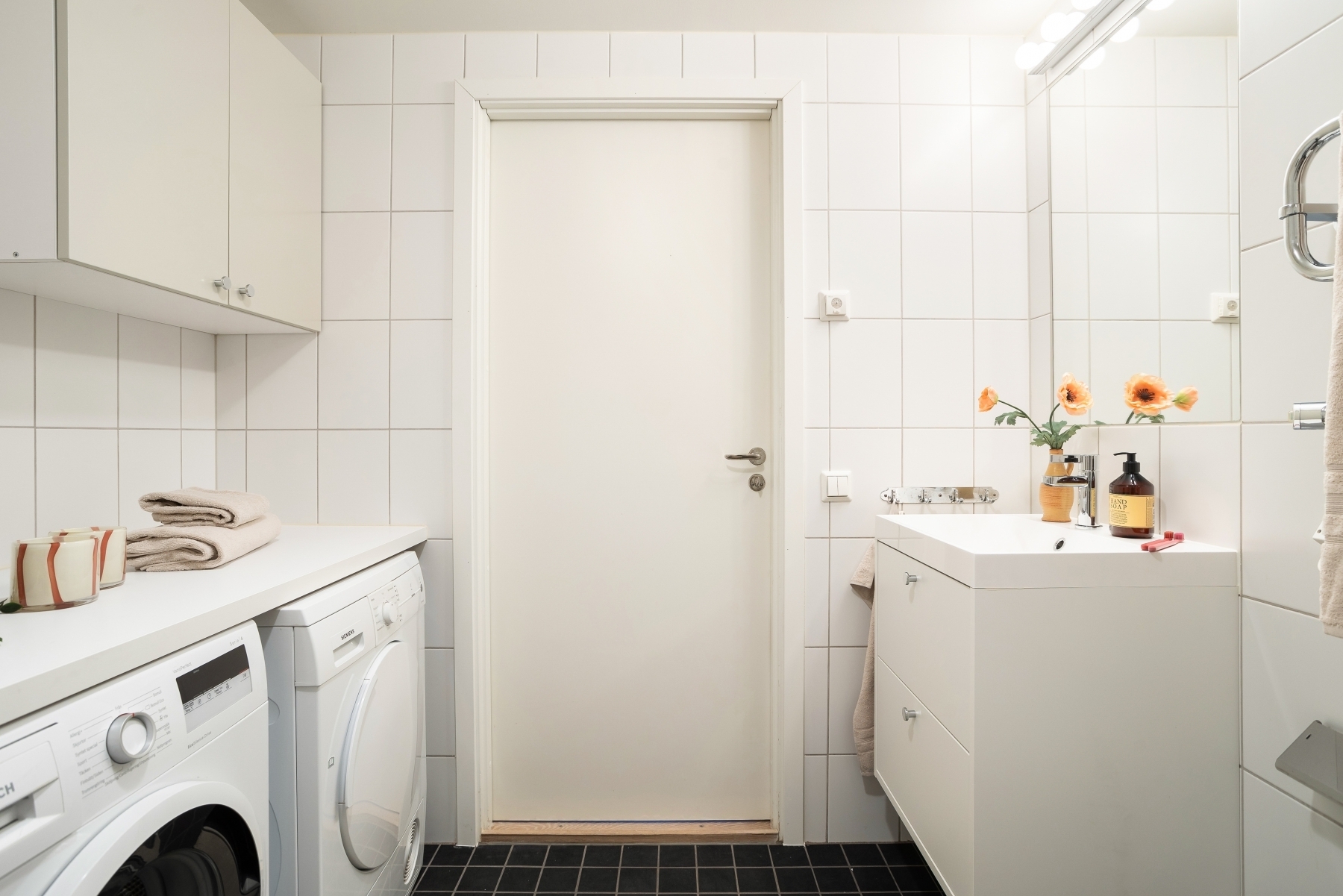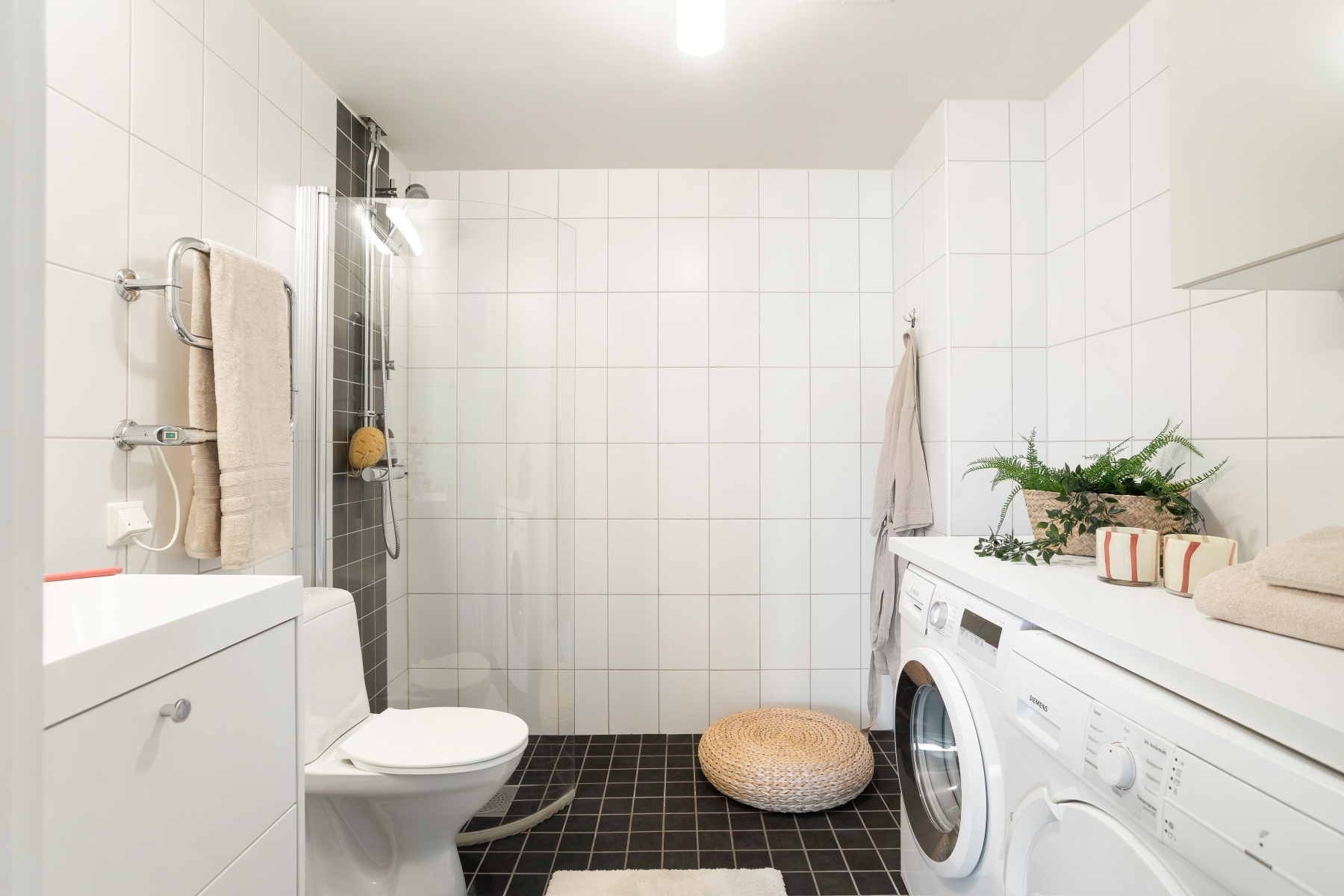 Välplanerat och stilrent badrum med ljusa, helkaklade väggar och ett mörkt klinkergolv med golvvärme för extra komfort. Här finns en rymlig dusch med klarglasvägg, toalett, handdukstork samt ett handfat med kommod som erbjuder bra förvaring för dina dagliga behov. Den praktiska tvättdelen är utrustad med både tvättmaskin och torktumlare, placerade under en generös avlastningsbänk – perfekt för att vika och organisera tvätt. Ovanför tvättdelen finns vägghängda överskåp som ger extra förvaringsutrymme för handdukar, tvättmedel och andra nödvändigheter.