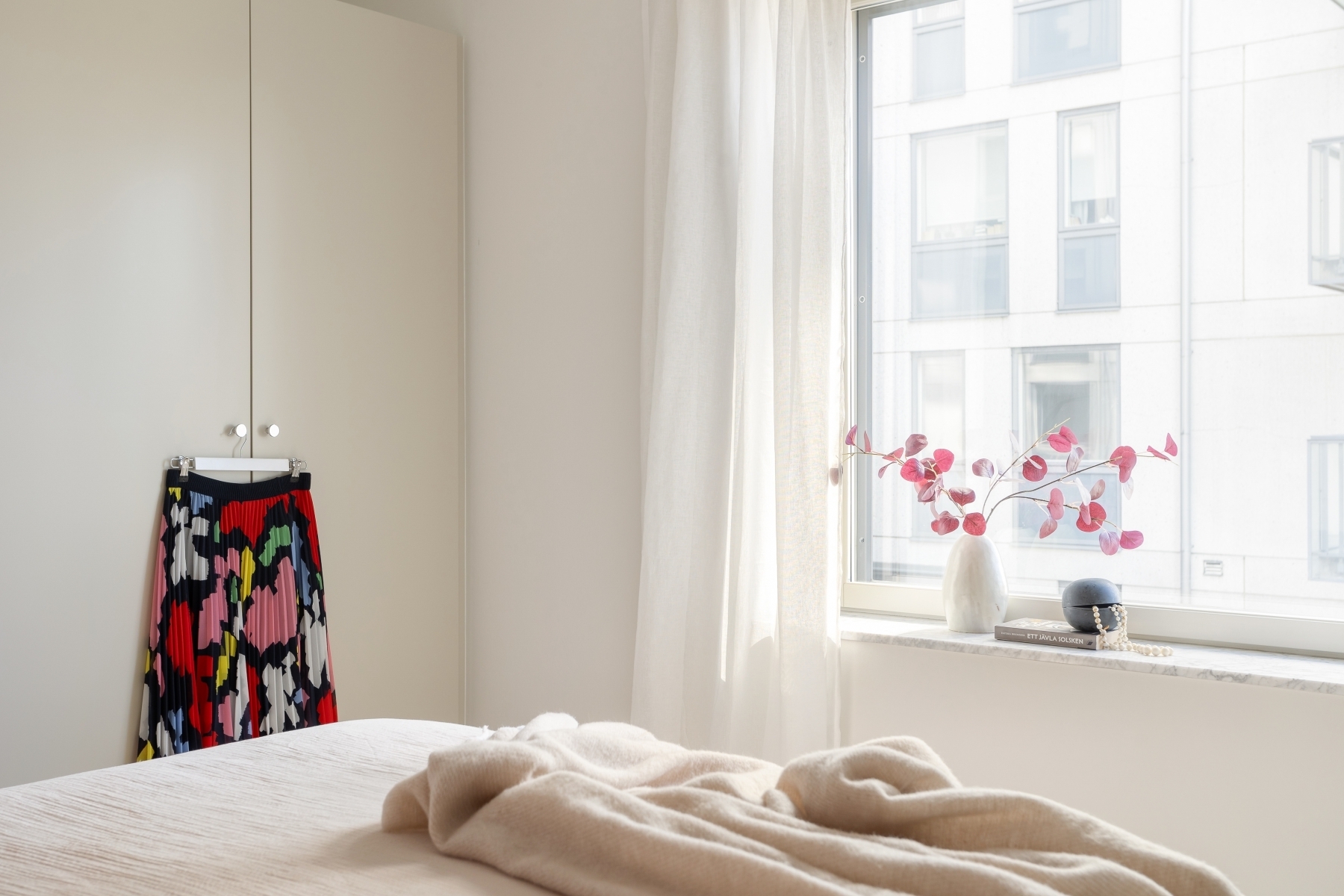 Ett rofyllt och generöst sovrum som erbjuder en perfekt plats för avkoppling. Här finns gott om plats för en stor dubbelsäng och sängbord, och det stora glaspartiet ger rummet ett mjukt och behagligt ljus som förhöjer den luftiga och harmoniska känslan. en perfekt plats för att dra sig tillbaka till för en god natts sömn eller en lång, avkopplande morgon. De stilrena garderoberna, i linje med bostadens övriga snickerier, erbjuder gott om förvaring och bidrar till ett organiserat intryck.