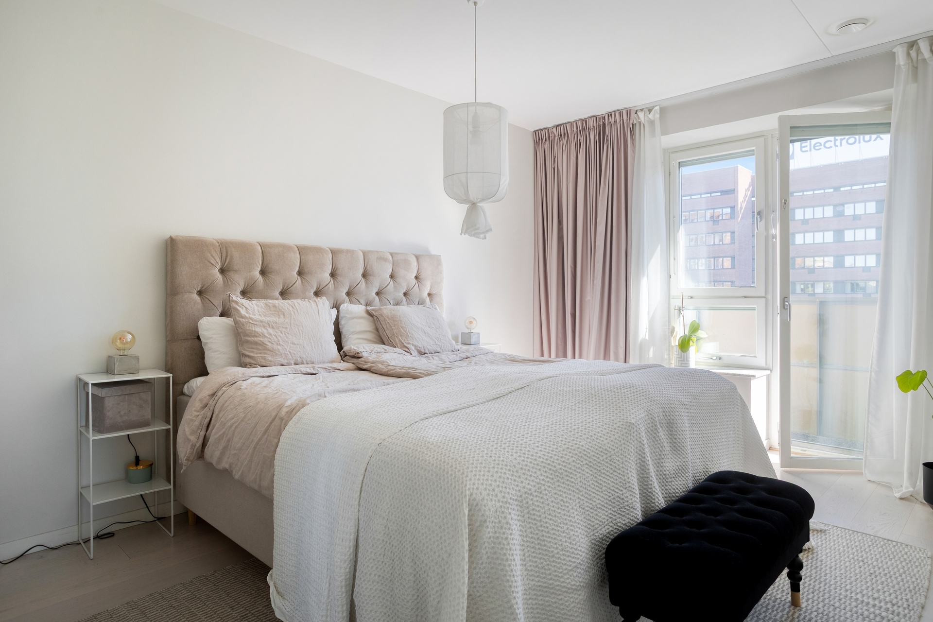 Harmoniskt och luftigt sovrum med plats för dubbelsäng och byrå, bakom skjutdörrar finns lägenhetens rymlig walk-in-closet/förråd. Utgång till balkongen.