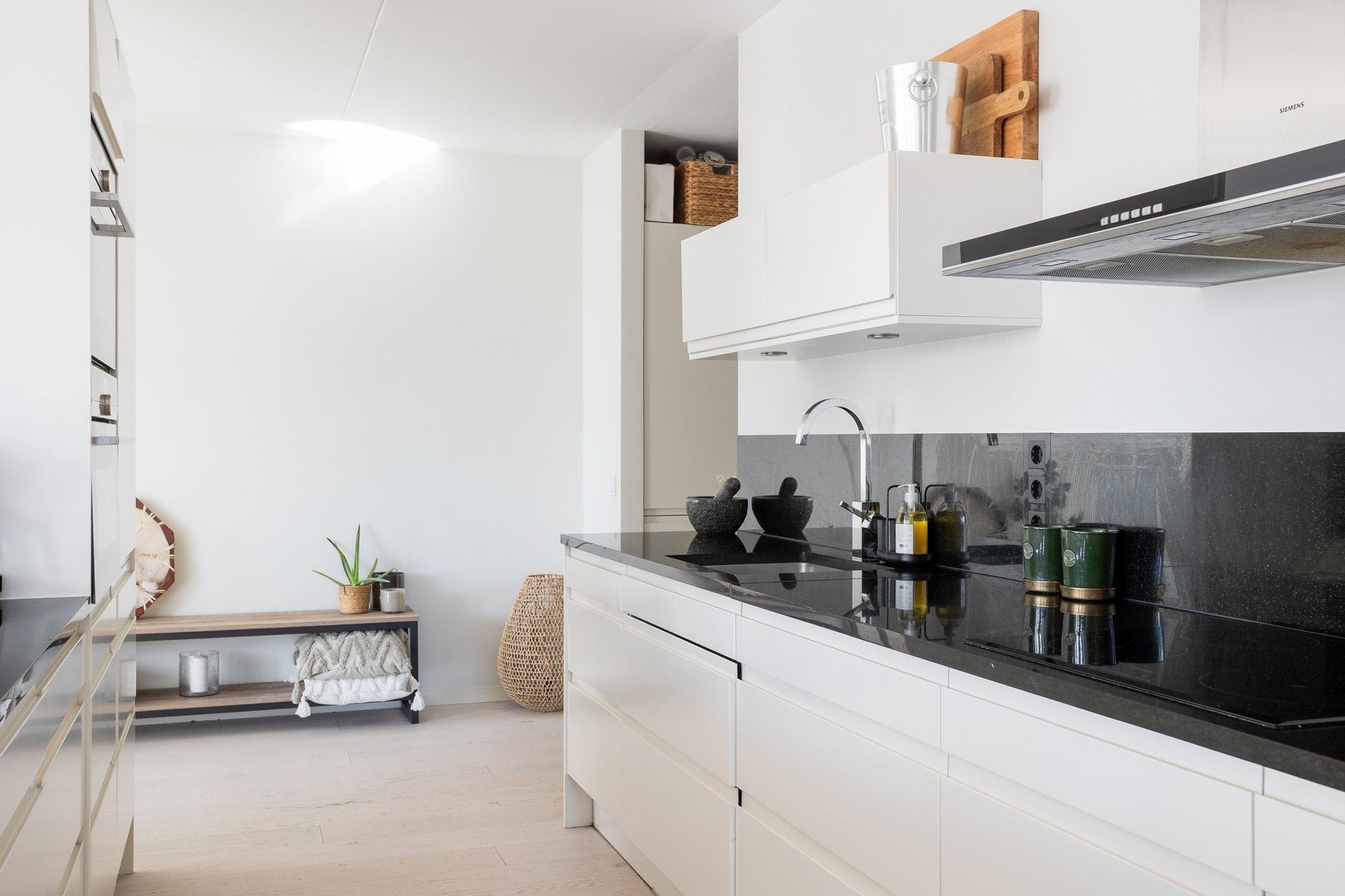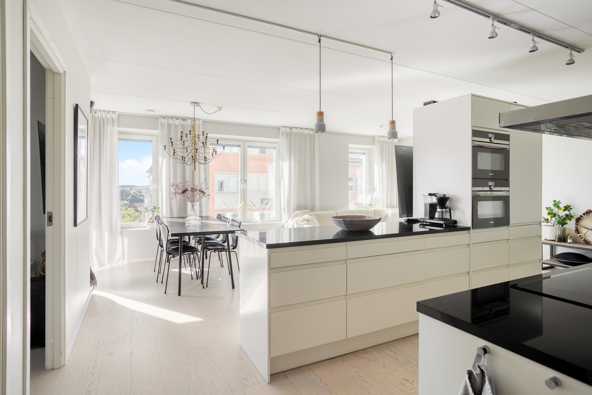 Snyggt och socialt HTH-kök med öppen planlösning till vardagsrummet och gott om förvaring. Vita skåpsluckor, bänkskiva + stänkskydd i svart granit, integrerad diskmaskin, induktionshäll, varmluftsugn, micro, rostfri köksfläk samt integrerad kyl och frys. Ett kök som inspirerar till matlagning och middagar med vänner!