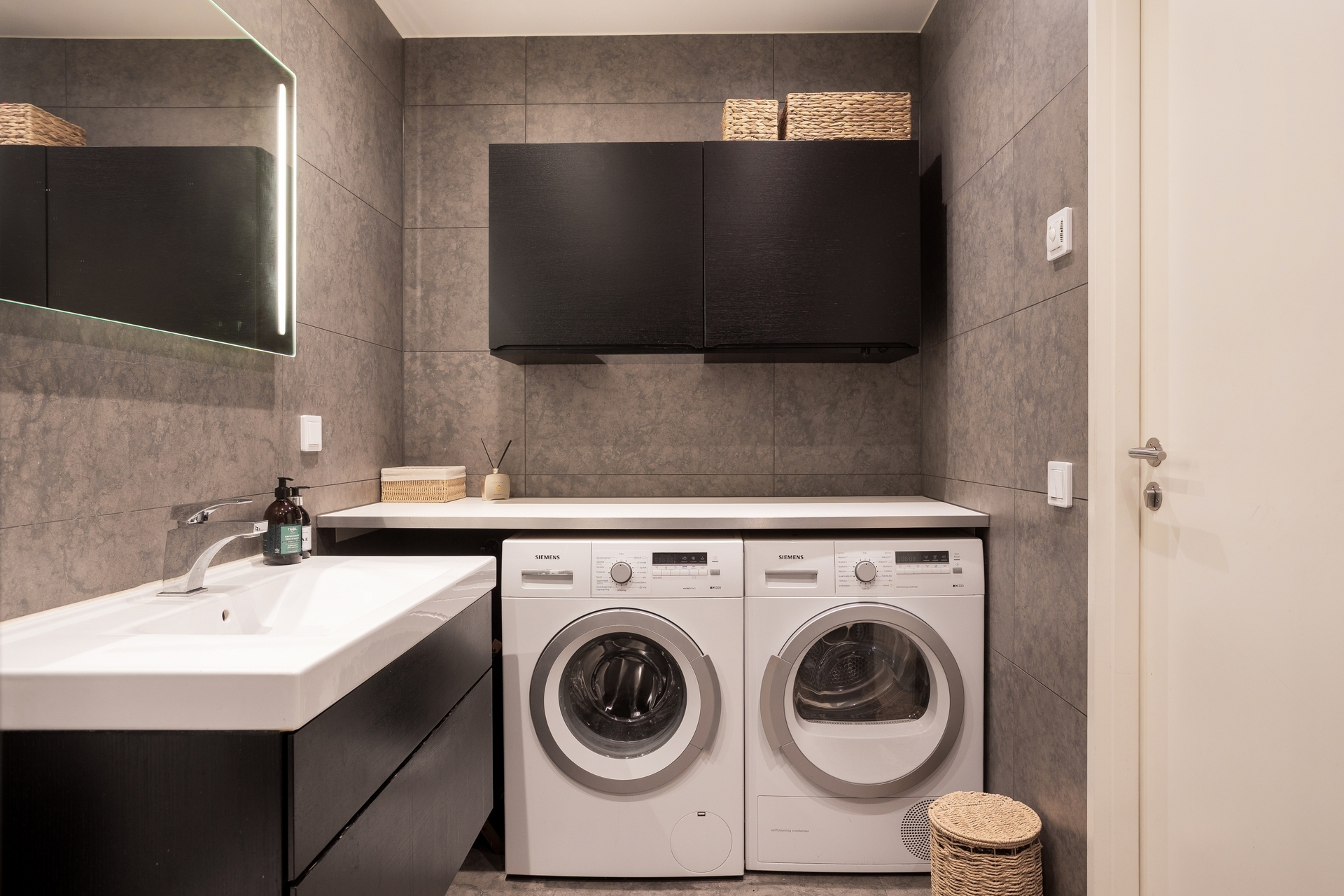 Stora lyxiga kalkstens inspirerade kakelplattor klär väggarna med matchande klinkers på golvet, komfortvärme. Väggspegel med integrerad belysning ovan handfat med svart kommod. Matchande till komoden hänger överskåp ovan tvättmaskin, torktumlare och den vita arbetsbänken. Badrummet är även utrustat med wc samt dusch med glasvägg och takdusch. Spotlights i tak.