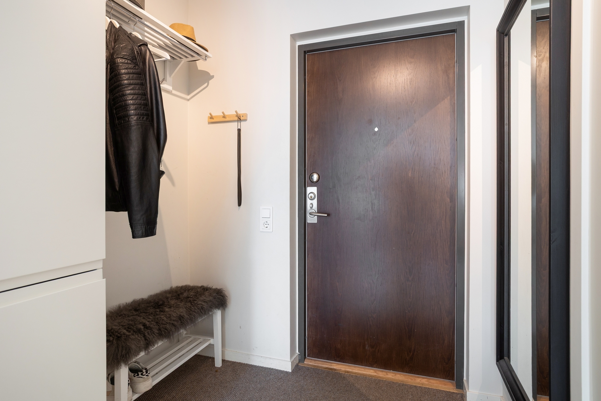Inbjudande hall via säkerhetsdörr med gott om plats för avhängning av ytterkläder och skor. Förvaring i garderob och städskåp. Ingång till badrummet. Vitmålande väggar.