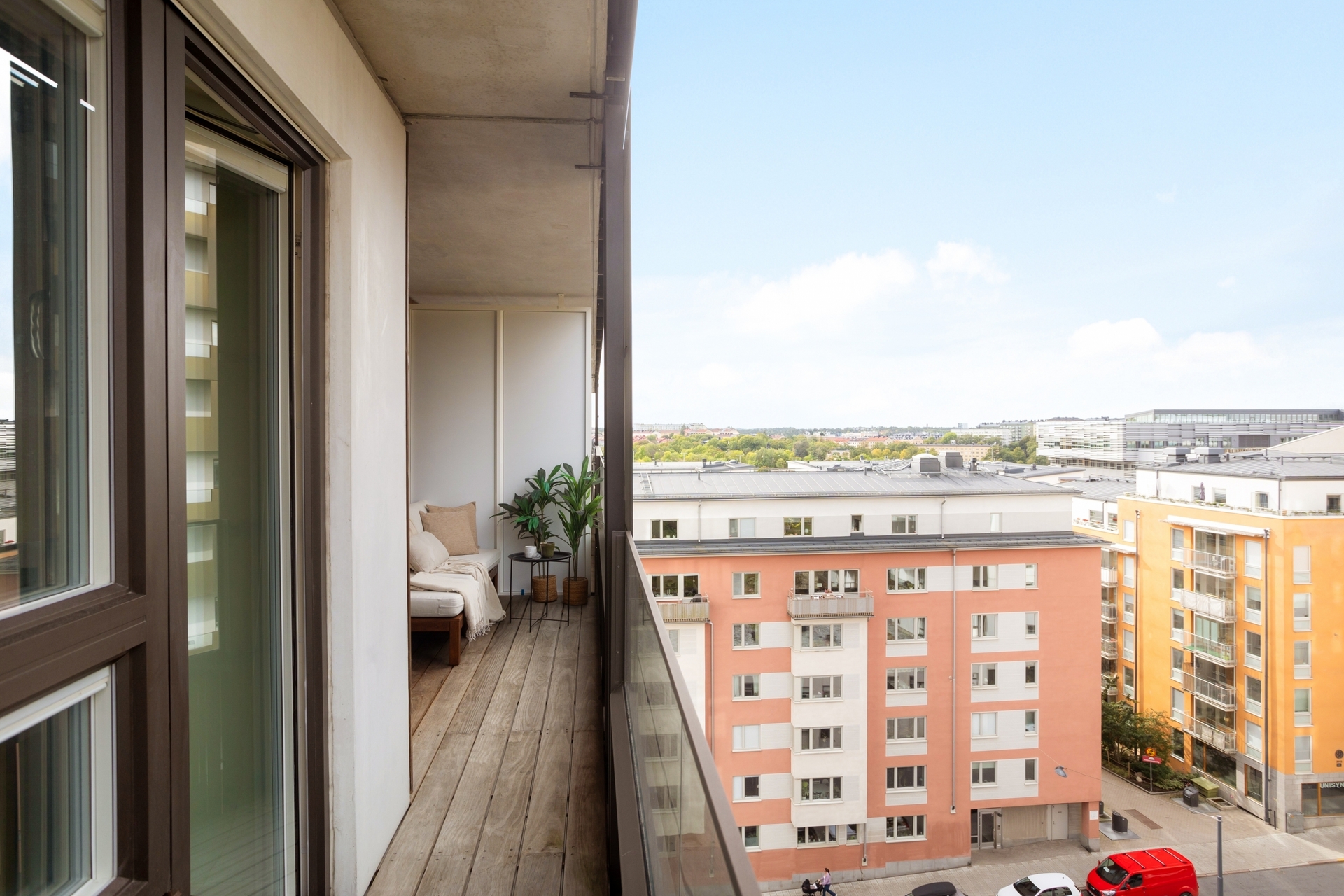 Välplanerad gavel-3:a med stor inglasad balkong och eftermiddagssol på vån 12.