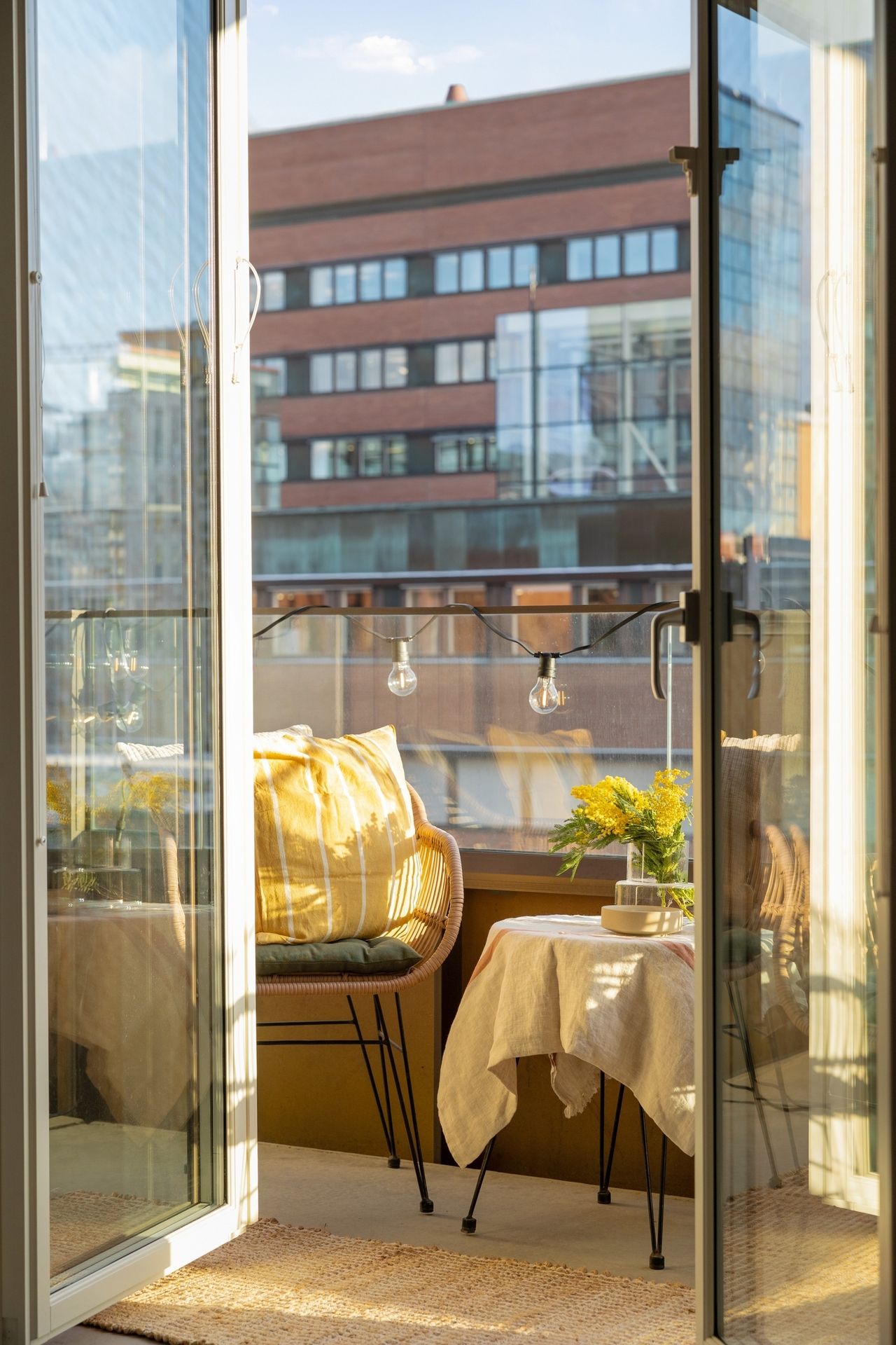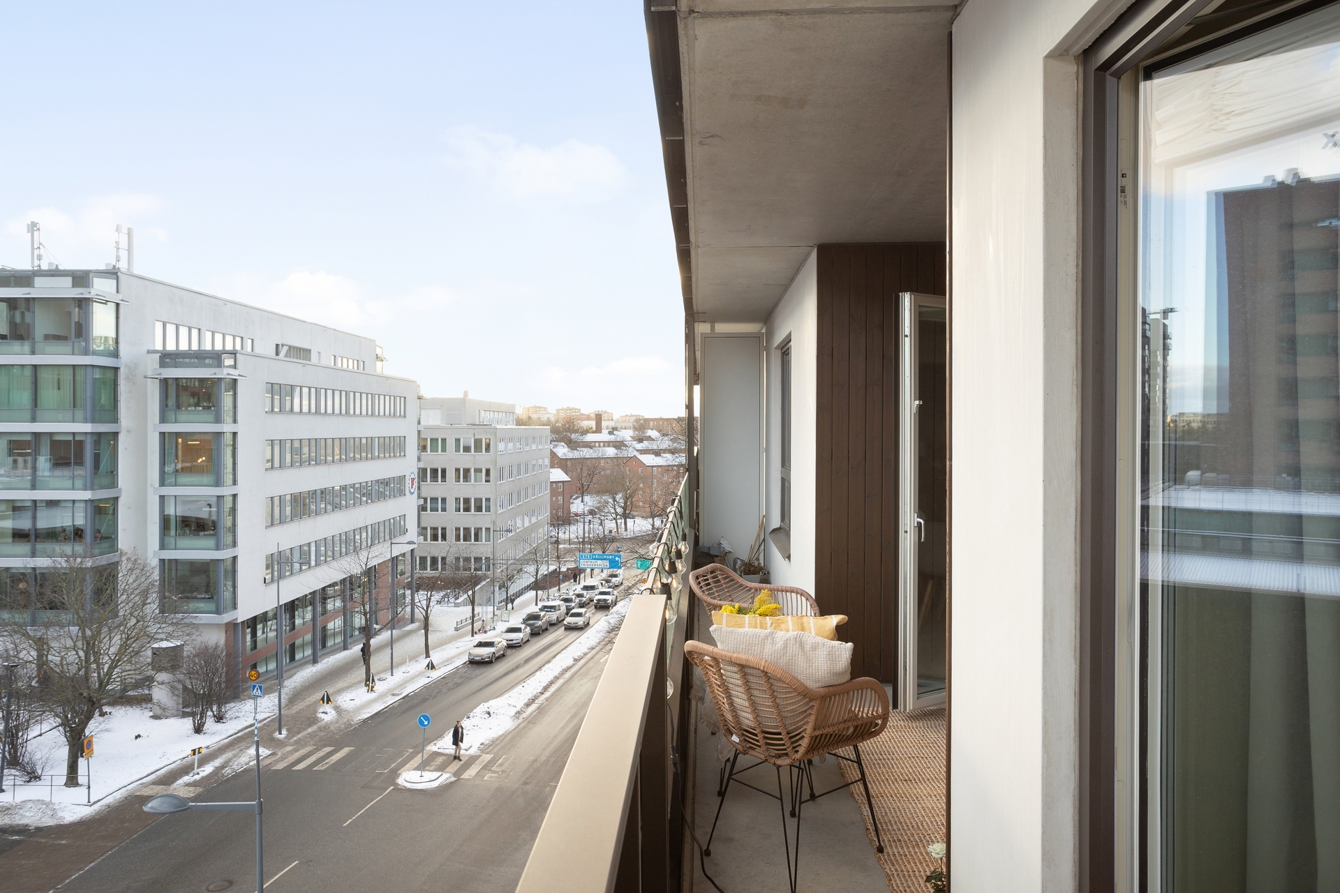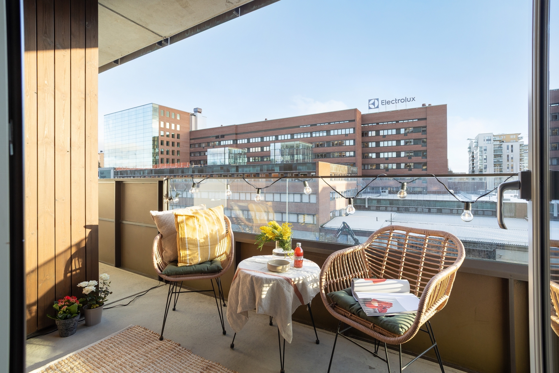 Ljuvlig balkong i med sol från morgon till tidig eftermiddag. Plats för en ordentlig loungemöbel eller bord och stolar för den som önskar. Vacker och fri utsikt.