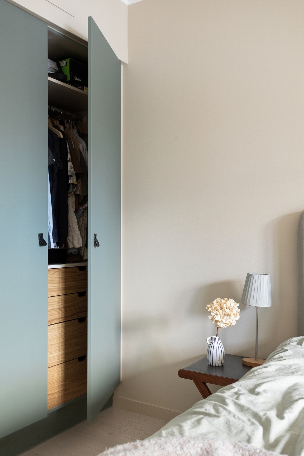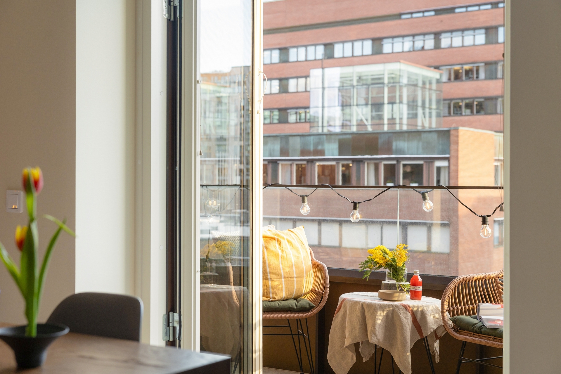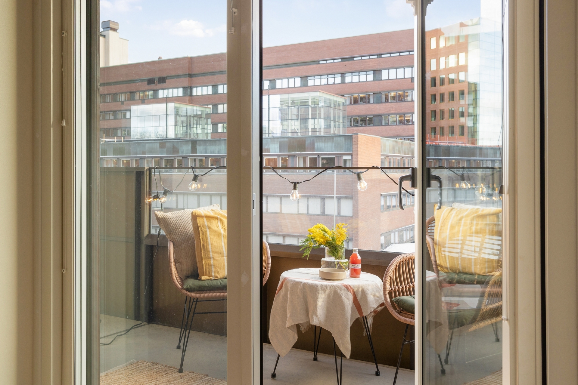 Det stora och rofyllda sovrummet rymmer enkelt en dubbelsäng och god förvaring. Från vardagsrummet nås den generösa balkongen med sol från morgon till tidig eftermiddag, en idealisk plats för frukost, avkoppling och växter.