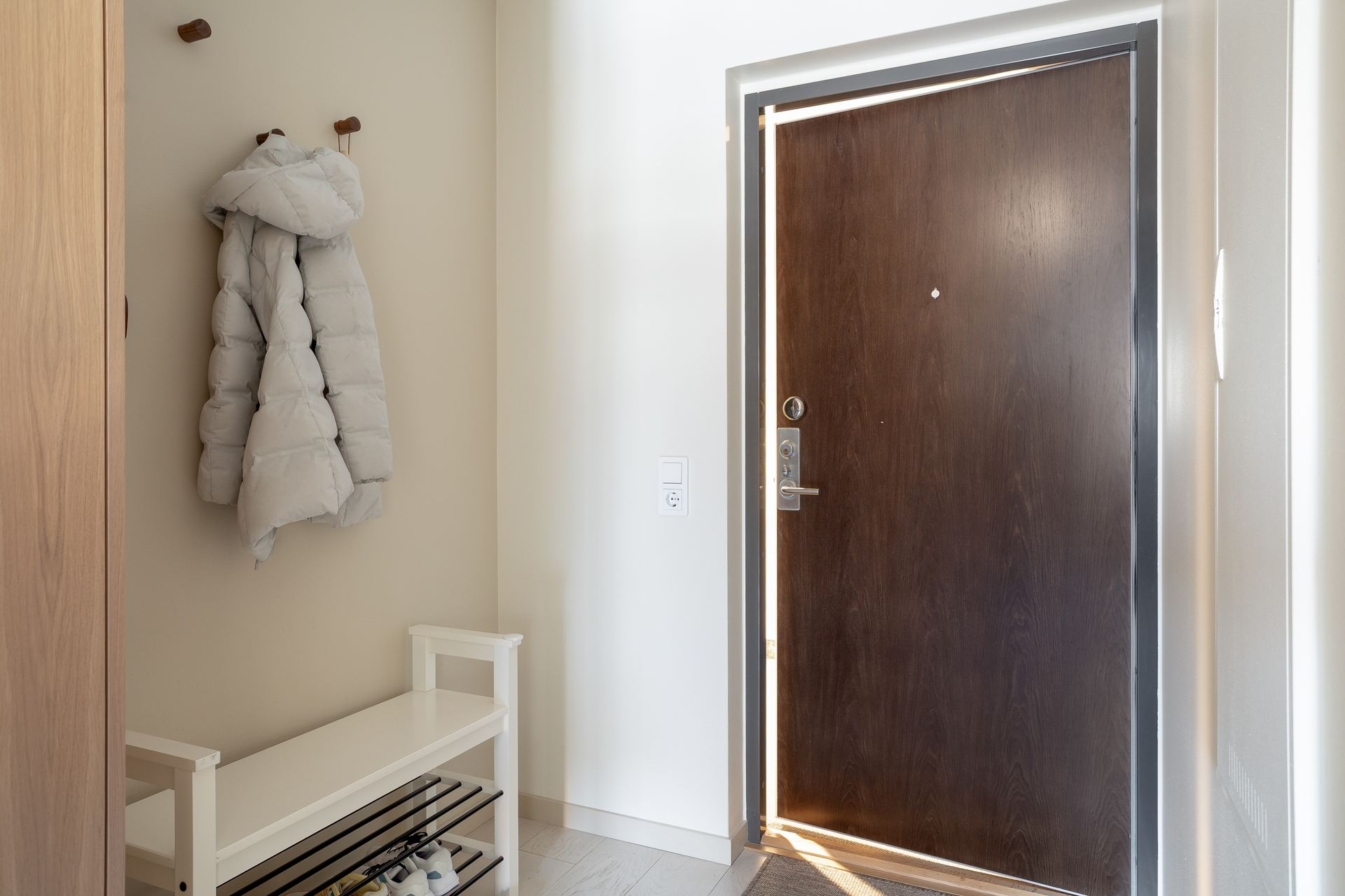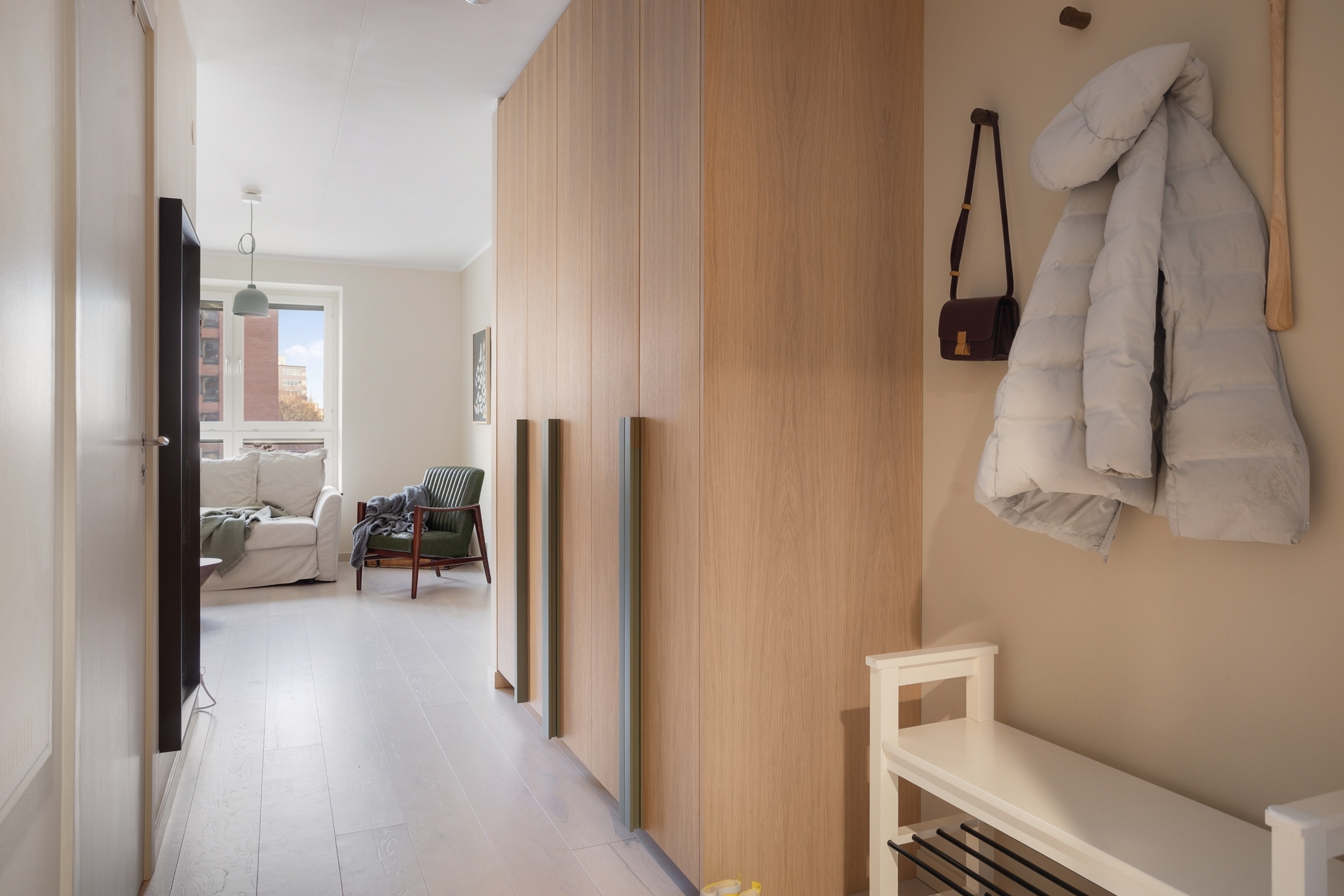Välplanerad hall med gott om förvaring i garderobsvägg. Golvet är vitlaserad ekplank och är genomgående i hela bostaden. Väggarna är målade.