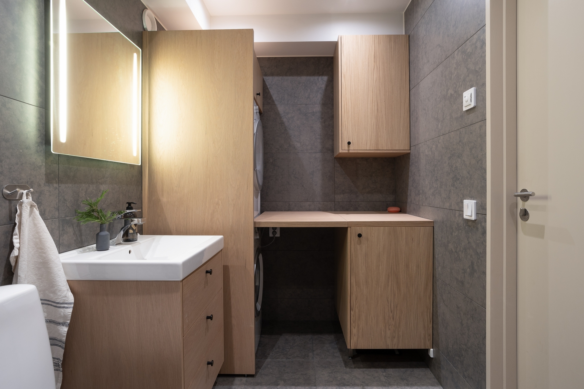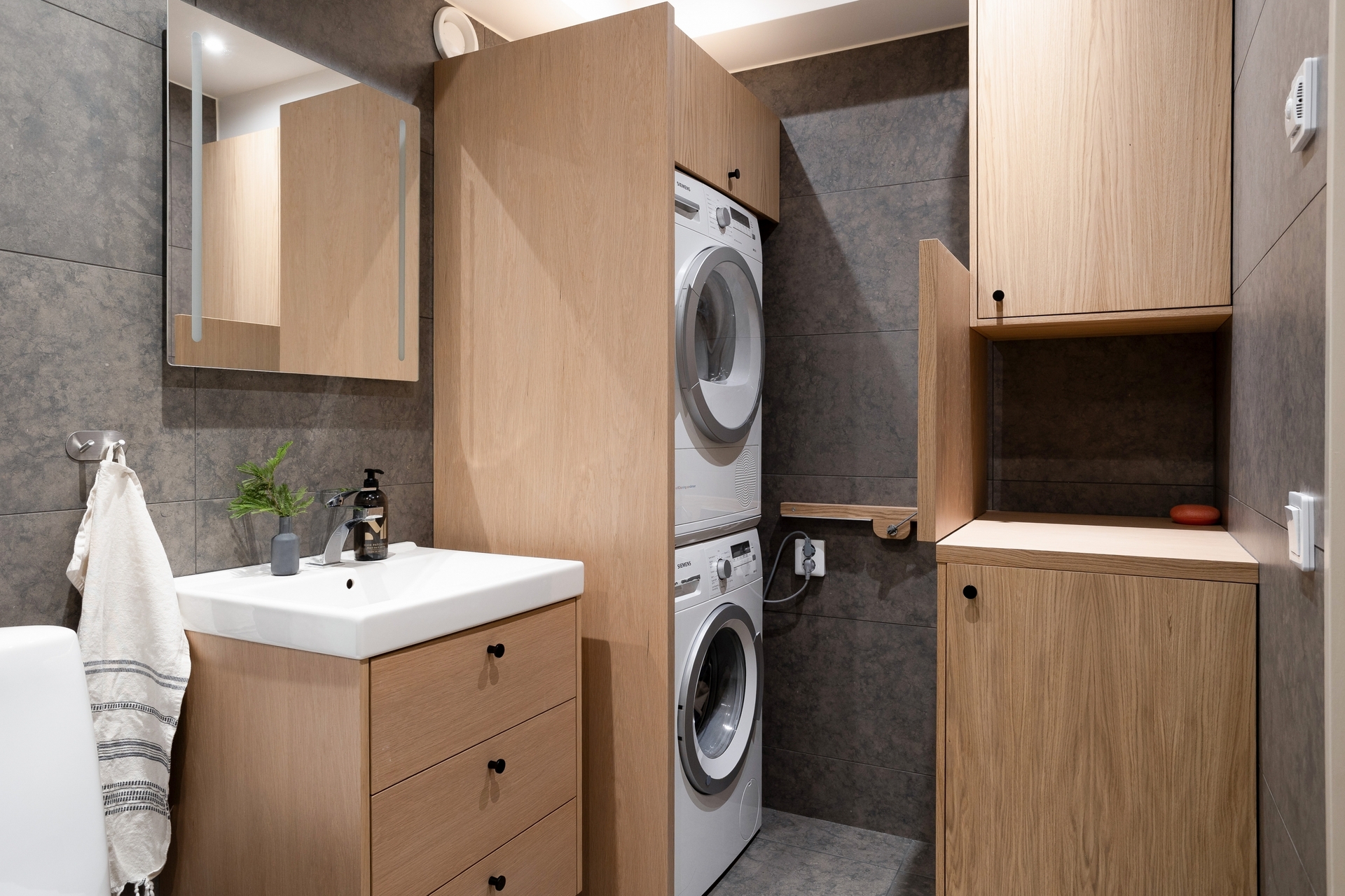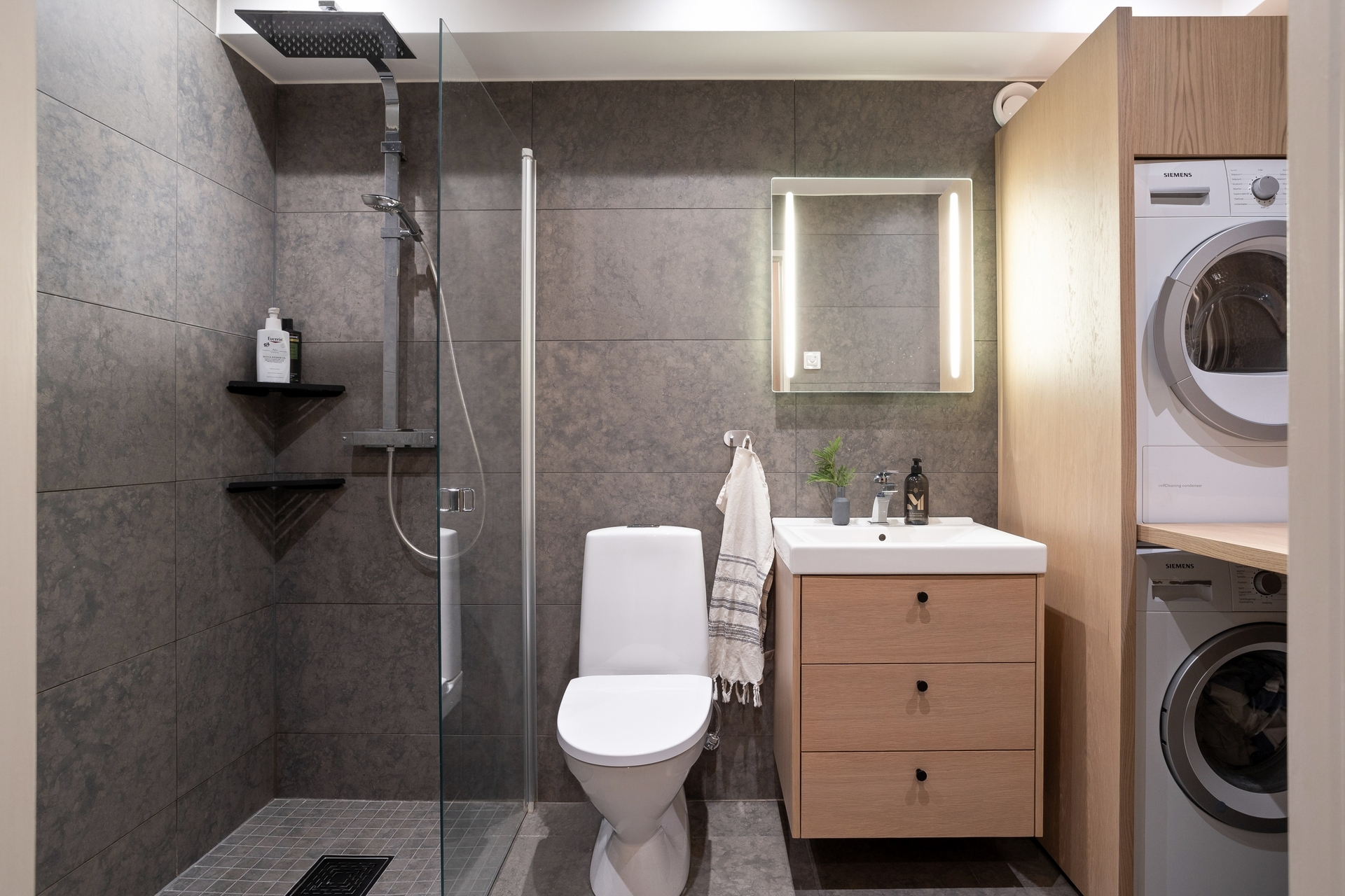 Exklusivt helkaklat badrum med stilfulla val. Väggar och golv är beklädda med ett mörkt klinker och i taket finner ni infällda spotlights. Fullt utrustat med duschvägg, toalettstol, handfat med kommod samt tvättmaskin och torktummlare med bänk ovan och överskåp. Komfortvärme.