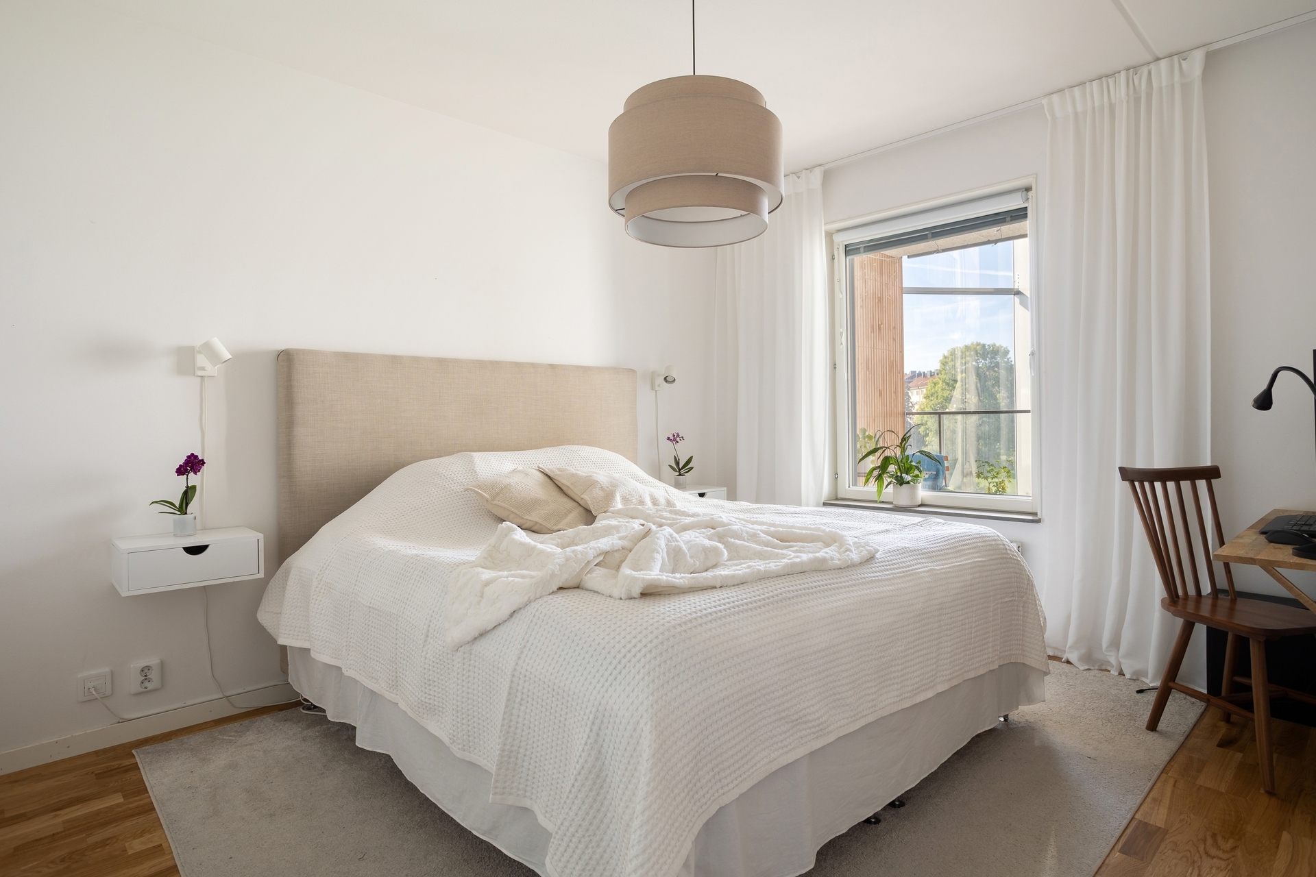 Högt upp i huset, walk-in-closet och solig inglasad balkong i väst.