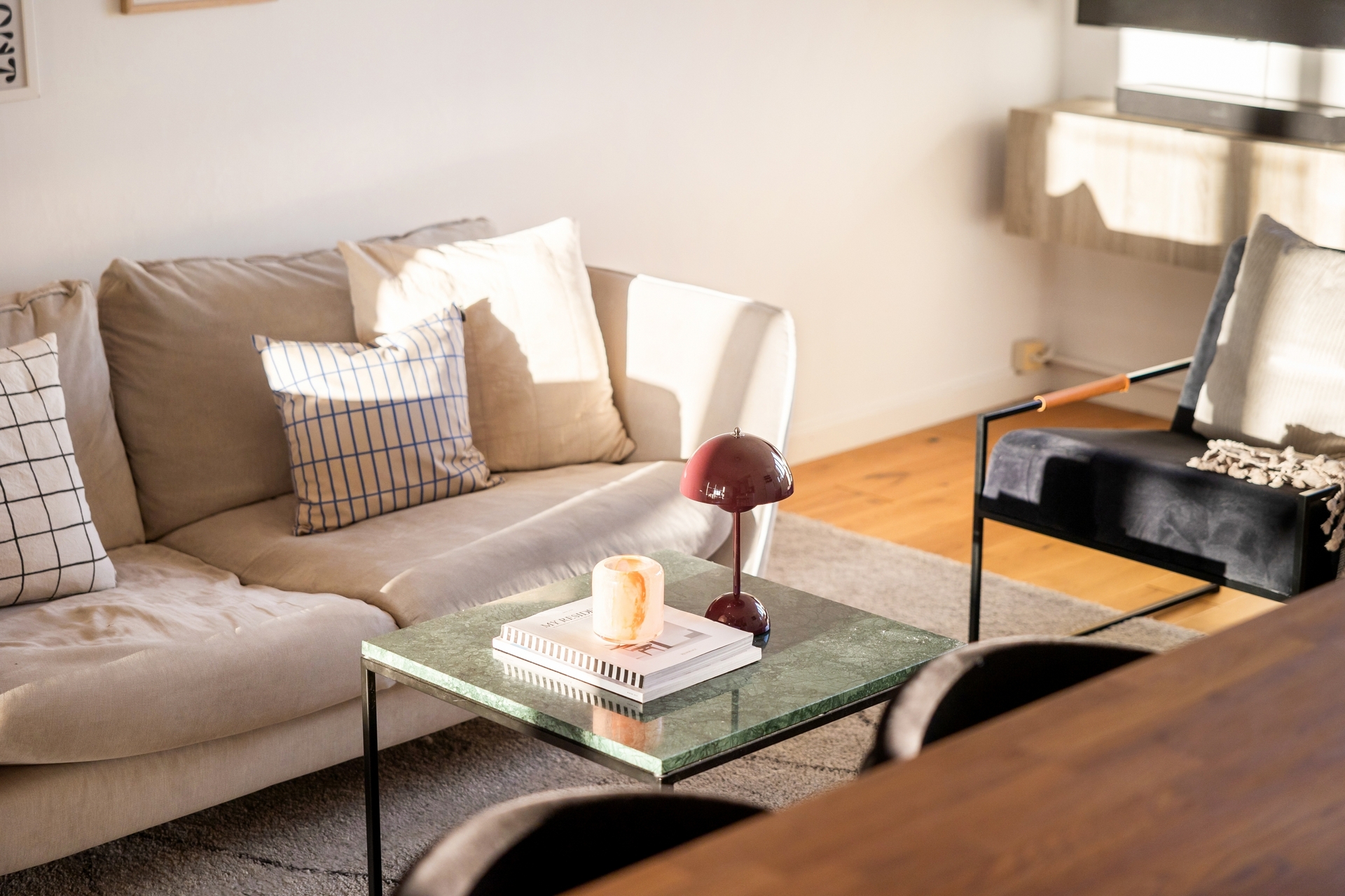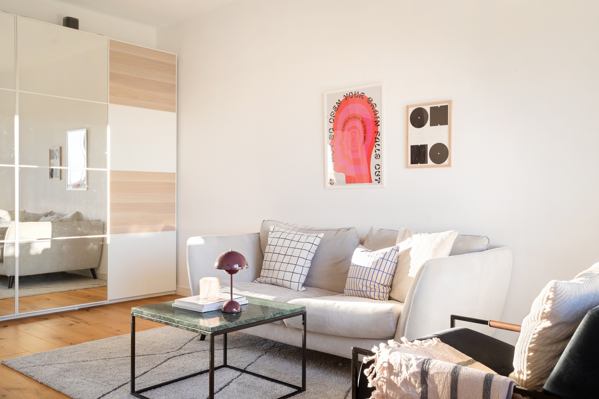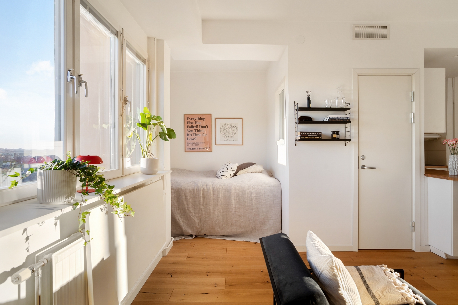 Ljust och luftigt vardagsrum som erbjuder en öppen och social planlösning mot köket – perfekt för samvaro och middagar med vänner eller familj. Rummet rymmer plats för soffa, soffbord och mediamöbel. Bra förvaringsmöjligheter erbjuds även i stor skjutdörrsgarderob. De stora fönsterpartierna bjuder på en fantastisk utsikt samtidigt som det insynsskyddade läget ger en känsla av avskildhet. Här finns plats för avkoppling i en harmonisk miljö.