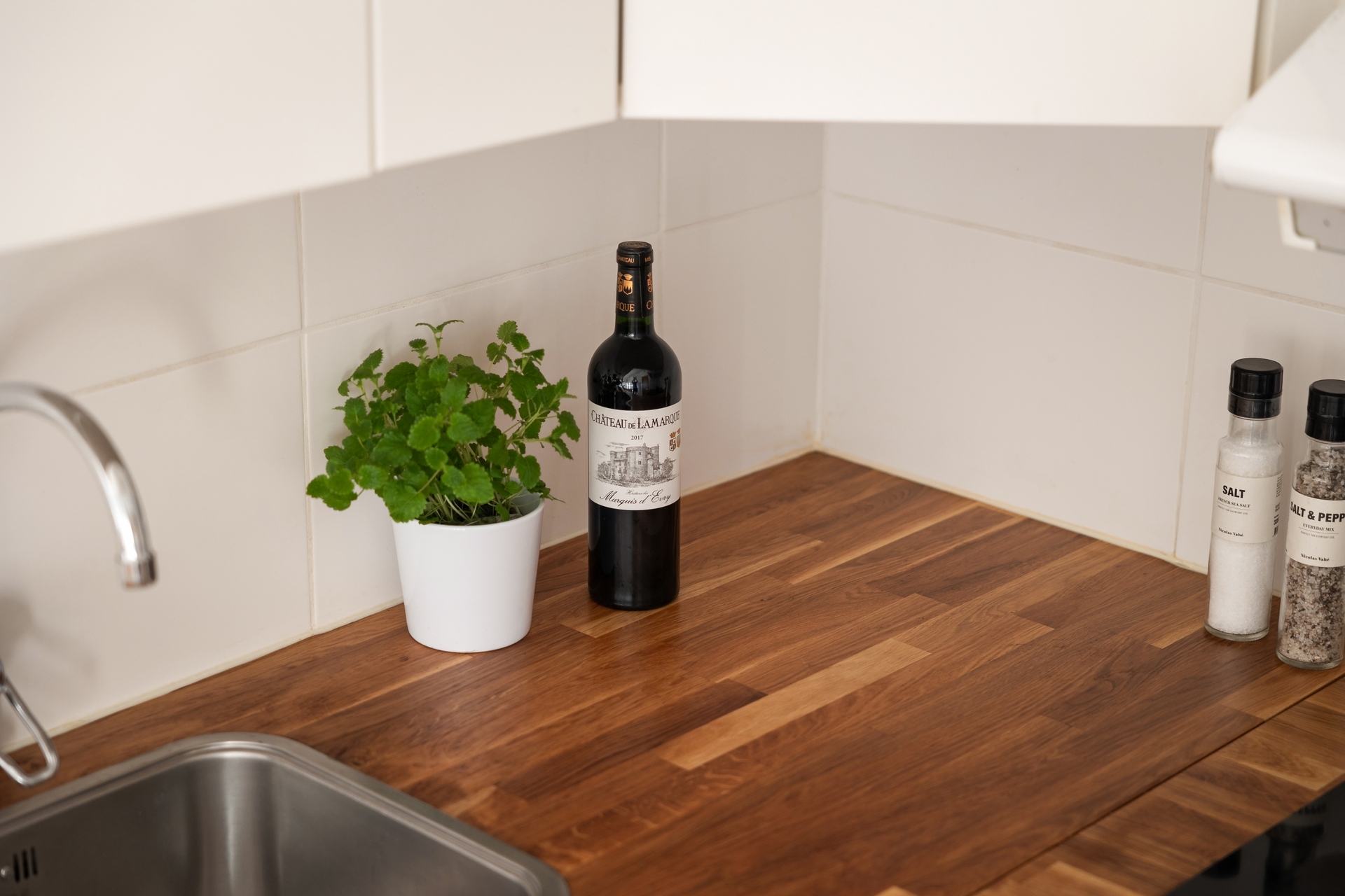Stilrent och funktionellt kök med gott om arbetsytor och smart förvaring bakom klassiska vita skåpsluckor. Köket är fullt utrustat med diskho, diskmaskin, spis, ugn, spisfläkt samt kyl/frys. Överskåpens integrerade spotlights ger ett behagligt ljus över bänkskivan i massiv ek och det eleganta stänkskyddet i vitt kakel. En bänkskiva med överhäng ger plats för barstolar och skapar en naturlig matplats för goda måltider.