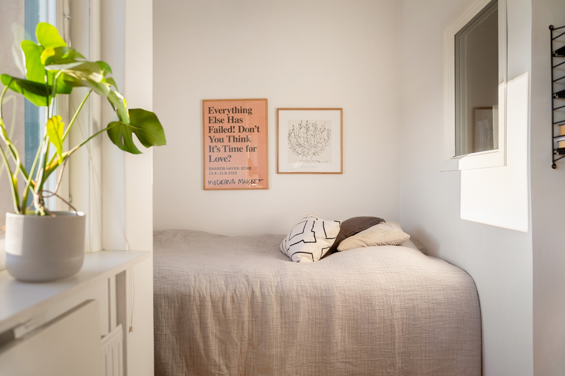 Avskild och rofylld sovalkov som rymmer en större säng. Det naturliga ljusinsläppet från fönstret skapar en inbjudande och harmonisk atmosfär. Här kan du vakna upp till en fin utsikt och njuta av lugnet i ditt privata hörn av bostaden.